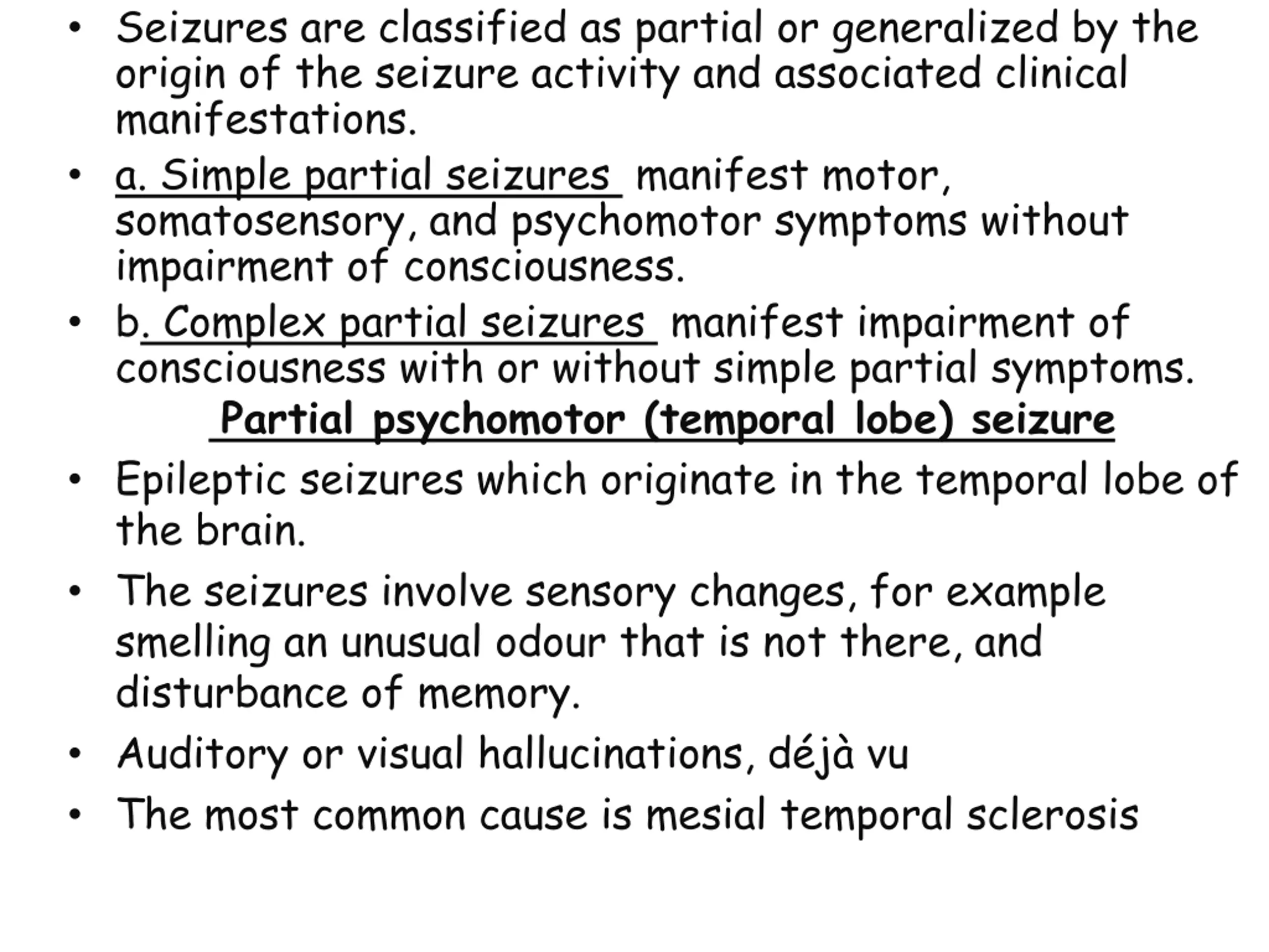 Seizures are classified as partial or generalized by the origin of the seizure activity and associated clinical manifestations. a. Simple partial seizures manifest motor, somatosensory, and psychomotor symptoms without impairment of consciousness. b. Complex partial seizures manifest impairment of consciousness with or without simple partial symptoms. Partial psychomotor (temporal lobe) seizure Epileptic seizures which originate in the temporal lobe of the brain. The seizures involve sensory changes, for example smelling an unusual odour that is not there, and disturbance of memory. Auditory or visual hallucinations, d j vu The most common cause is mesial temporal sclerosis