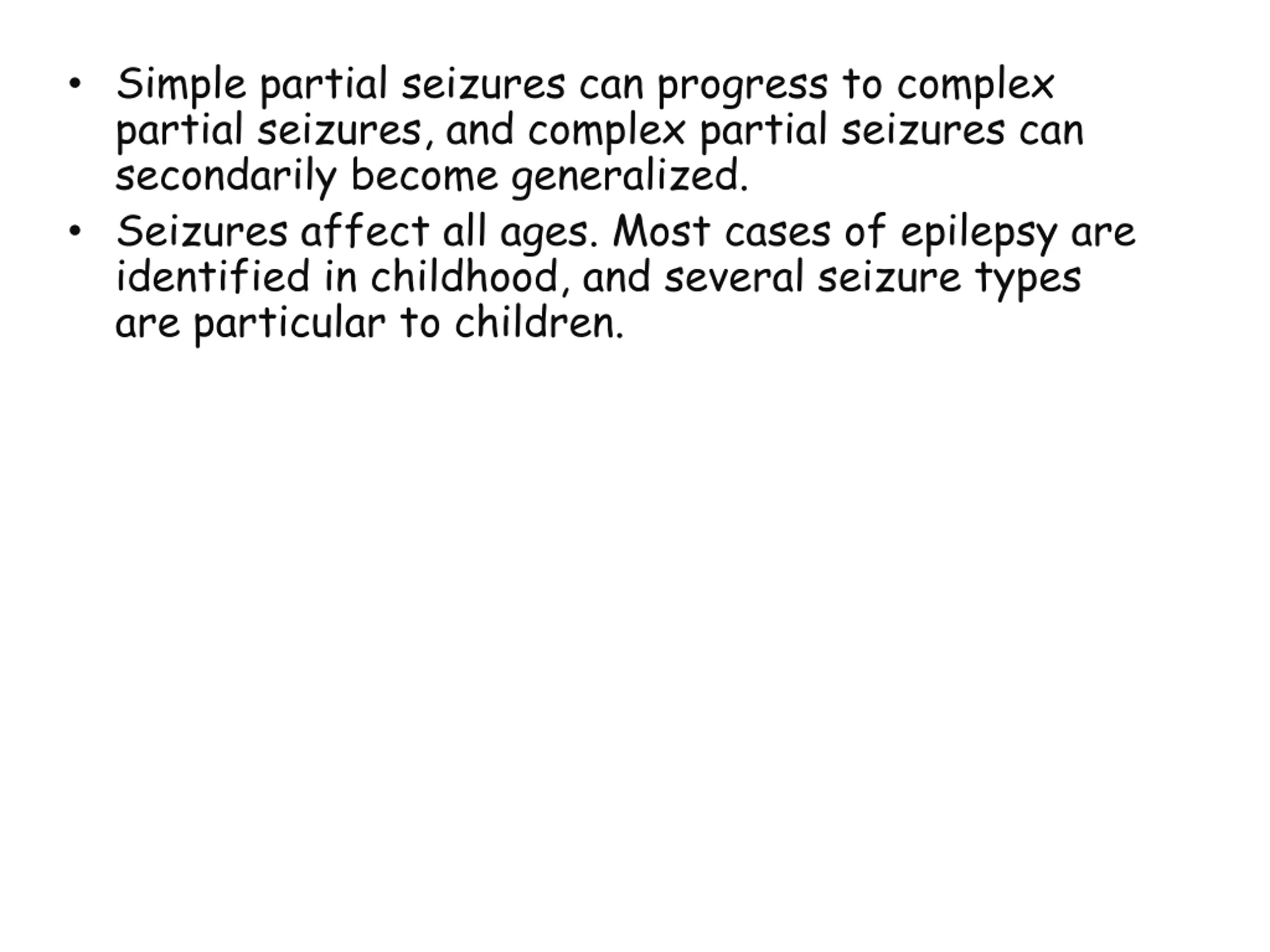 Simple partial seizures can progress to complex partial seizures, and complex partial seizures can secondarily become generalized. Seizures affect all ages. Most cases of epilepsy are identified in childhood, and several seizure types are particular to children.