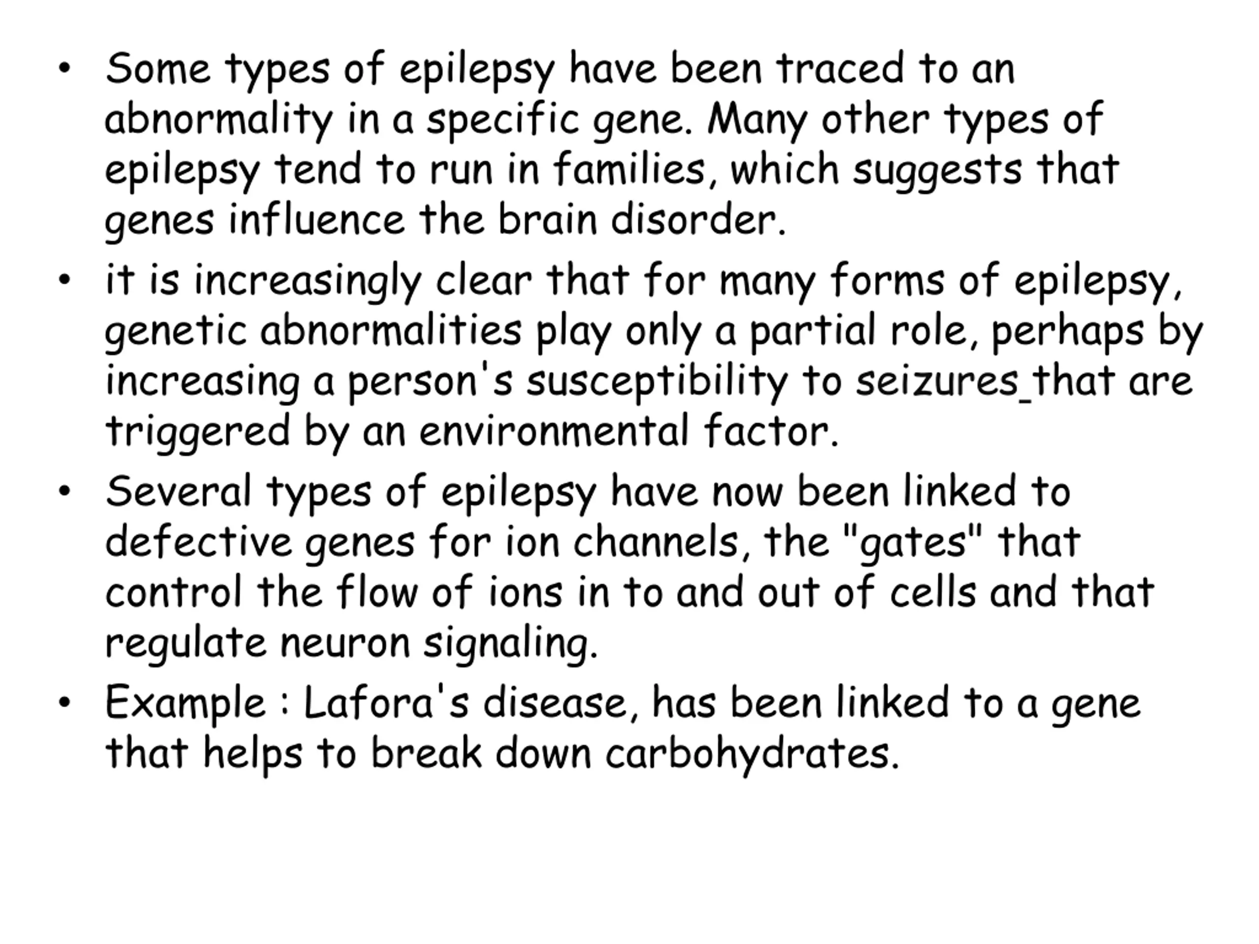 Some types of epilepsy have been traced to an abnormality in a specific gene. Many other types of epilepsy tend to run in families, which suggests that genes influence the brain disorder. it is increasingly clear that for many forms of epilepsy, genetic abnormalities play only a partial role, perhaps by increasing a person's susceptibility to seizures that are triggered by an environmental factor. Several types of epilepsy have now been linked to defective genes for ion channels, the "gates" that control the flow of ions in to and out of cells and that regulate neuron signaling. Example : Lafora's disease, has been linked to a gene that helps to break down carbohydrates.