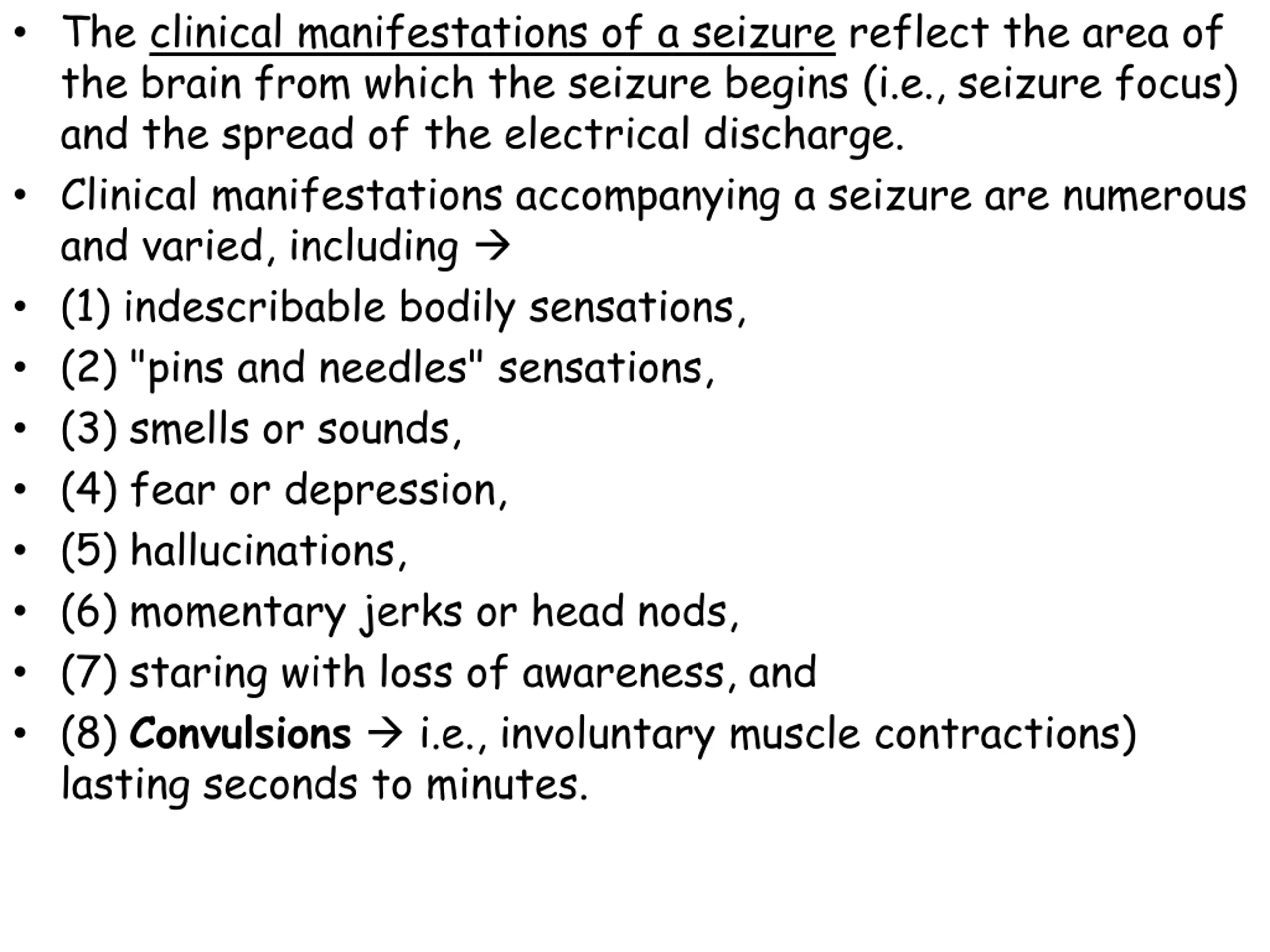 The clinical manifestations of a seizure reflect the area of the brain from which the seizure begins (i.e., seizure focus) and the spread of the electrical discharge. Clinical manifestations accompanying a seizure are numerous and varied, including (1) indescribable bodily sensations, (2) "pins and needles" sensations, (3) smells or sounds, (4) fear or depression, (5) hallucinations, (6) momentary jerks or head nods, (7) staring with loss of awareness, and (8) Convulsions i.e., involuntary muscle contractions) lasting seconds to minutes.