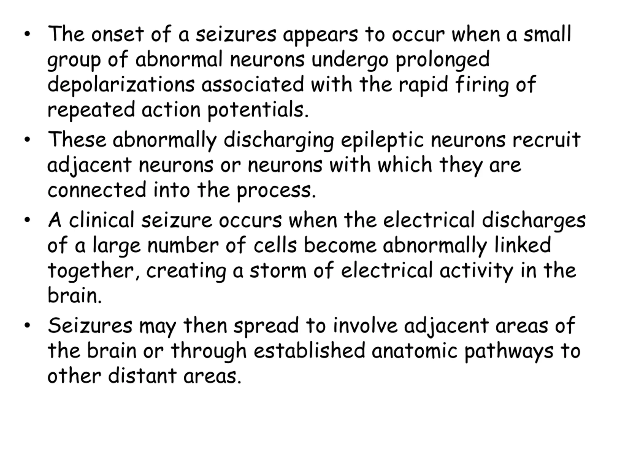 The onset of a seizures appears to occur when a small group of abnormal neurons undergo prolonged depolarizations associated with the rapid firing of repeated action potentials. These abnormally discharging epileptic neurons recruit adjacent neurons or neurons with which they are connected into the process. A clinical seizure occurs when the electrical discharges of a large number of cells become abnormally linked together, creating a storm of electrical activity in the brain. Seizures may then spread to involve adjacent areas of the brain or through established anatomic pathways to other distant areas.