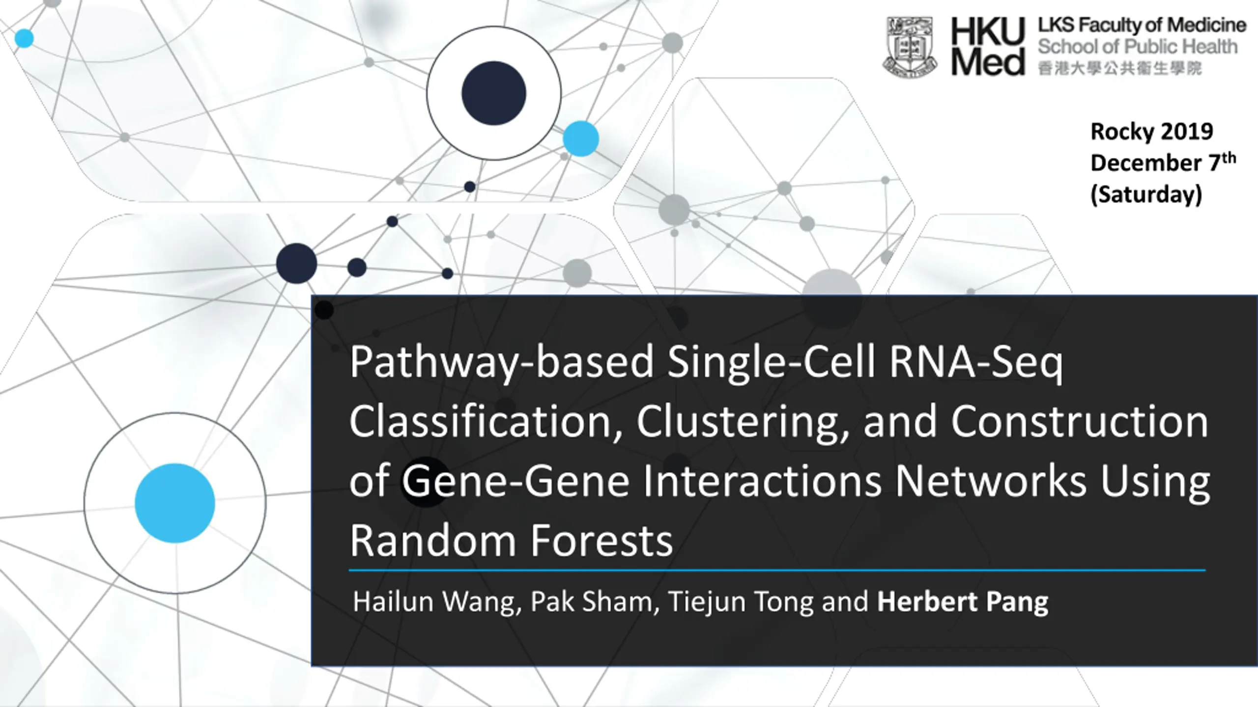 Rocky 2019 December 7th (Saturday) Pathway-based Single-Cell RNA-Seq Classification, Clustering, and Construction of Gene-Gene Interactions Networks Using Random Forests Hailun Wang, Pak Sham, Tiejun Tong and Herbert Pang