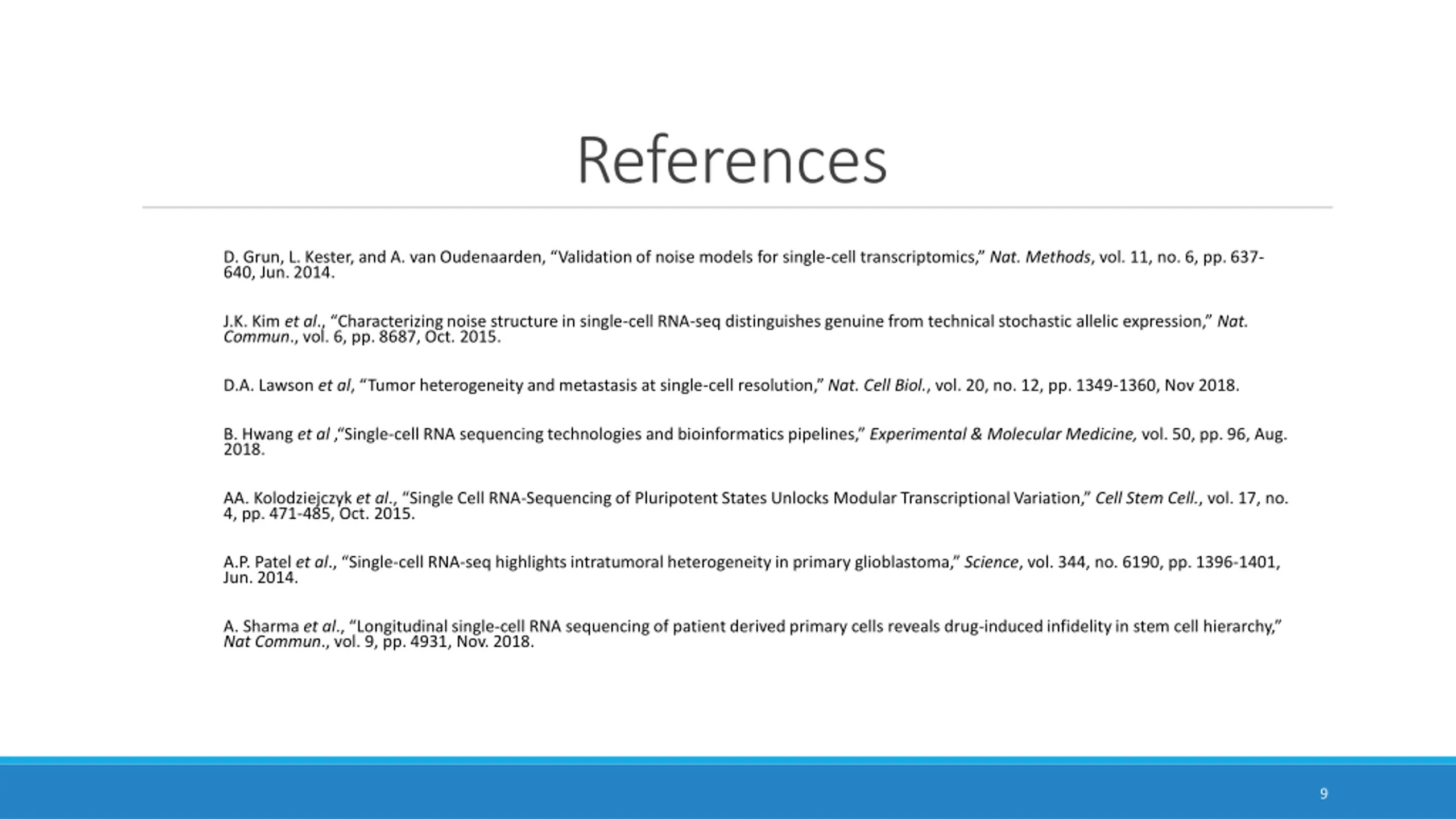 References D. Grun, L. Kester, and A. van Oudenaarden, Validation of noise models for single-cell transcriptomics, Nat. Methods, vol. 11, no. 6, pp. 637- 640, Jun. 2014. J.K. Kim et al., Characterizing noise structure in single-cell RNA-seq distinguishes genuine from technical stochastic allelic expression, Nat. Commun., vol. 6, pp. 8687, Oct. 2015. D.A. Lawson et al, Tumor heterogeneity and metastasis at single-cell resolution, Nat. Cell Biol., vol. 20, no. 12, pp. 1349-1360, Nov 2018. B. Hwang et al , Single-cell RNA sequencing technologies and bioinformatics pipelines, Experimental & Molecular Medicine, vol. 50, pp. 96, Aug. 2018. AA. Kolodziejczyk et al., Single Cell RNA-Sequencing of Pluripotent States Unlocks Modular Transcriptional Variation, Cell Stem Cell., vol. 17, no. 4, pp. 471-485, Oct. 2015. A.P. Patel et al., Single-cell RNA-seq highlights intratumoral heterogeneity in primary glioblastoma, Science, vol. 344, no. 6190, pp. 1396-1401, Jun. 2014. A. Sharma et al., Longitudinal single-cell RNA sequencing of patient derived primary cells reveals drug-induced infidelity in stem cell hierarchy, Nat Commun., vol. 9, pp. 4931, Nov. 2018. 9