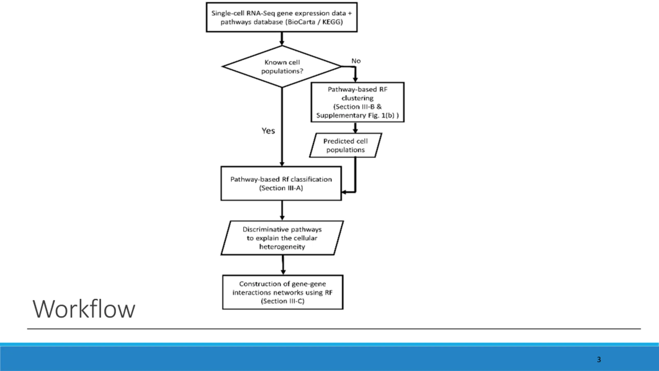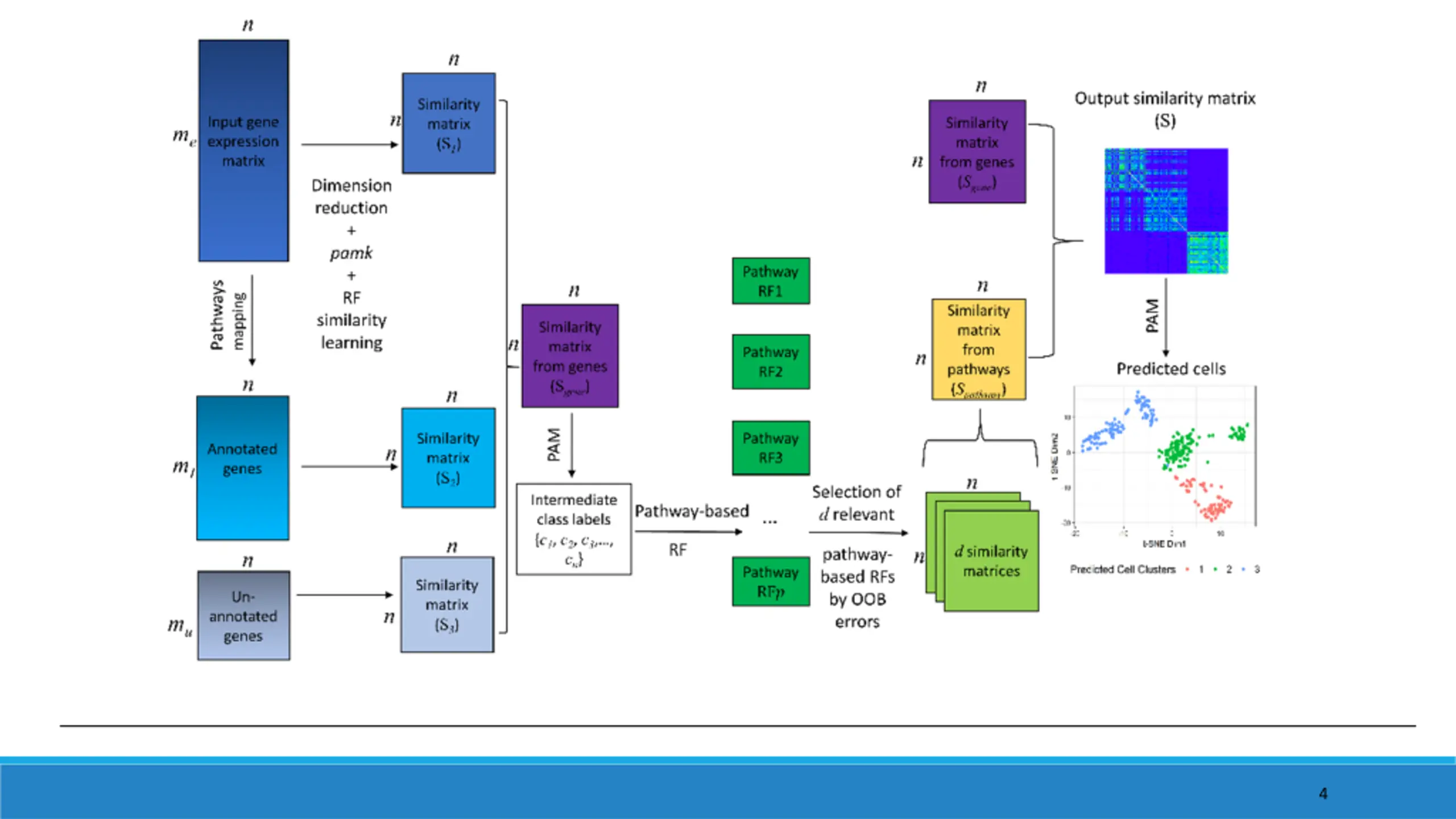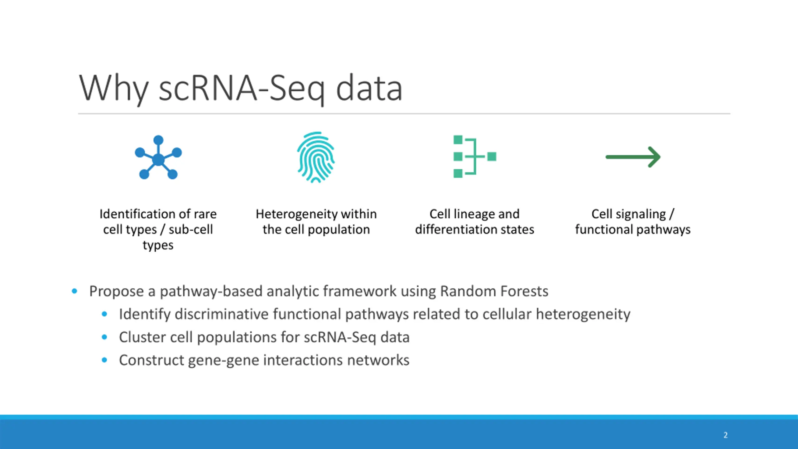 Why scRNA-Seq data Identification of rare cell types / sub-cell types Heterogeneity within the cell population Cell lineage and differentiation states Cell signaling / functional pathways Propose a pathway-based analytic framework using Random Forests Identify discriminative functional pathways related to cellular heterogeneity Cluster cell populations for scRNA-Seq data Construct gene-gene interactions networks 2
