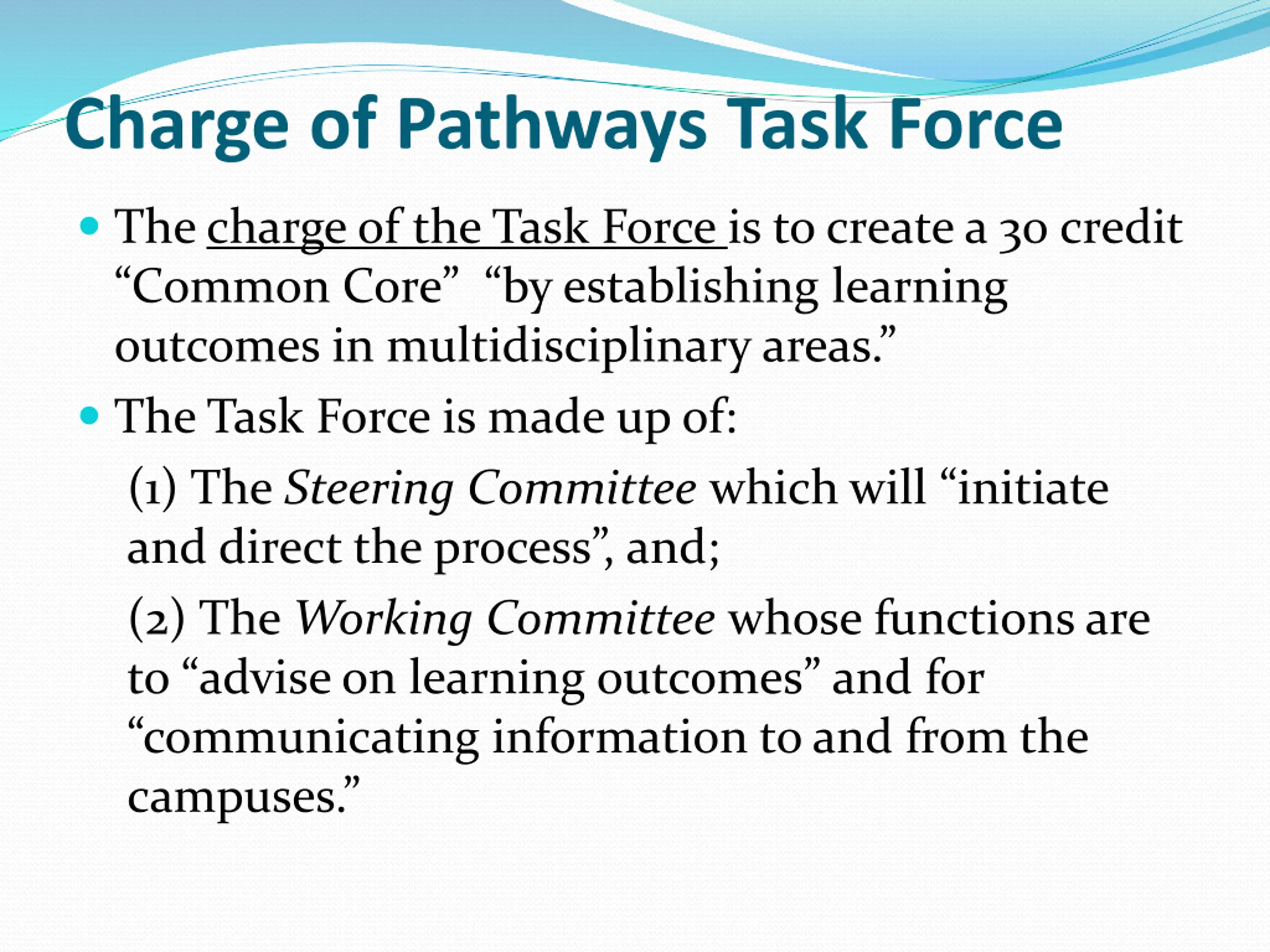 Charge of Pathways Task Force The charge of the Task Force is to create a 30 credit Common Core by establishing learning outcomes in multidisciplinary areas. The Task Force is made up of: (1) The Steering Committee which will initiate and direct the process , and; (2) The Working Committee whose functions are to advise on learning outcomes and for communicating information to and from the campuses.