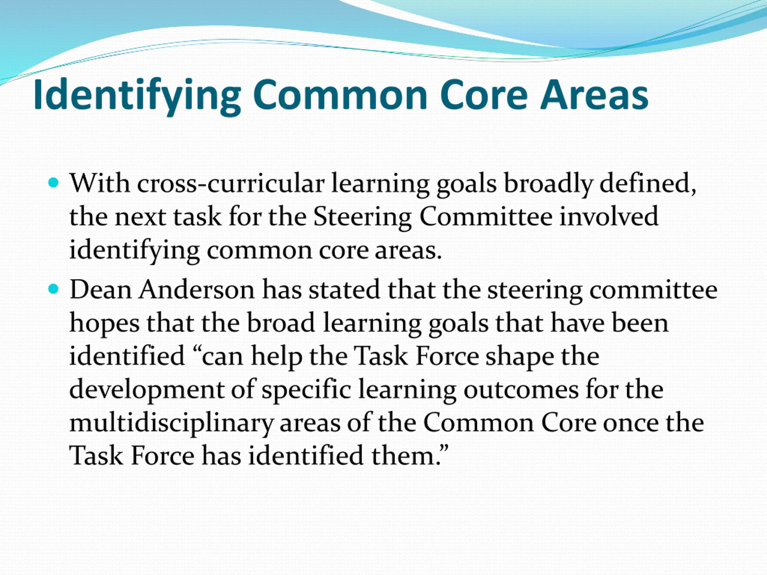 Identifying Common Core Areas With cross-curricular learning goals broadly defined, the next task for the Steering Committee involved identifying common core areas. Dean Anderson has stated that the steering committee hopes that the broad learning goals that have been identified can help the Task Force shape the development of specific learning outcomes for the multidisciplinary areas of the Common Core once the Task Force has identified them.