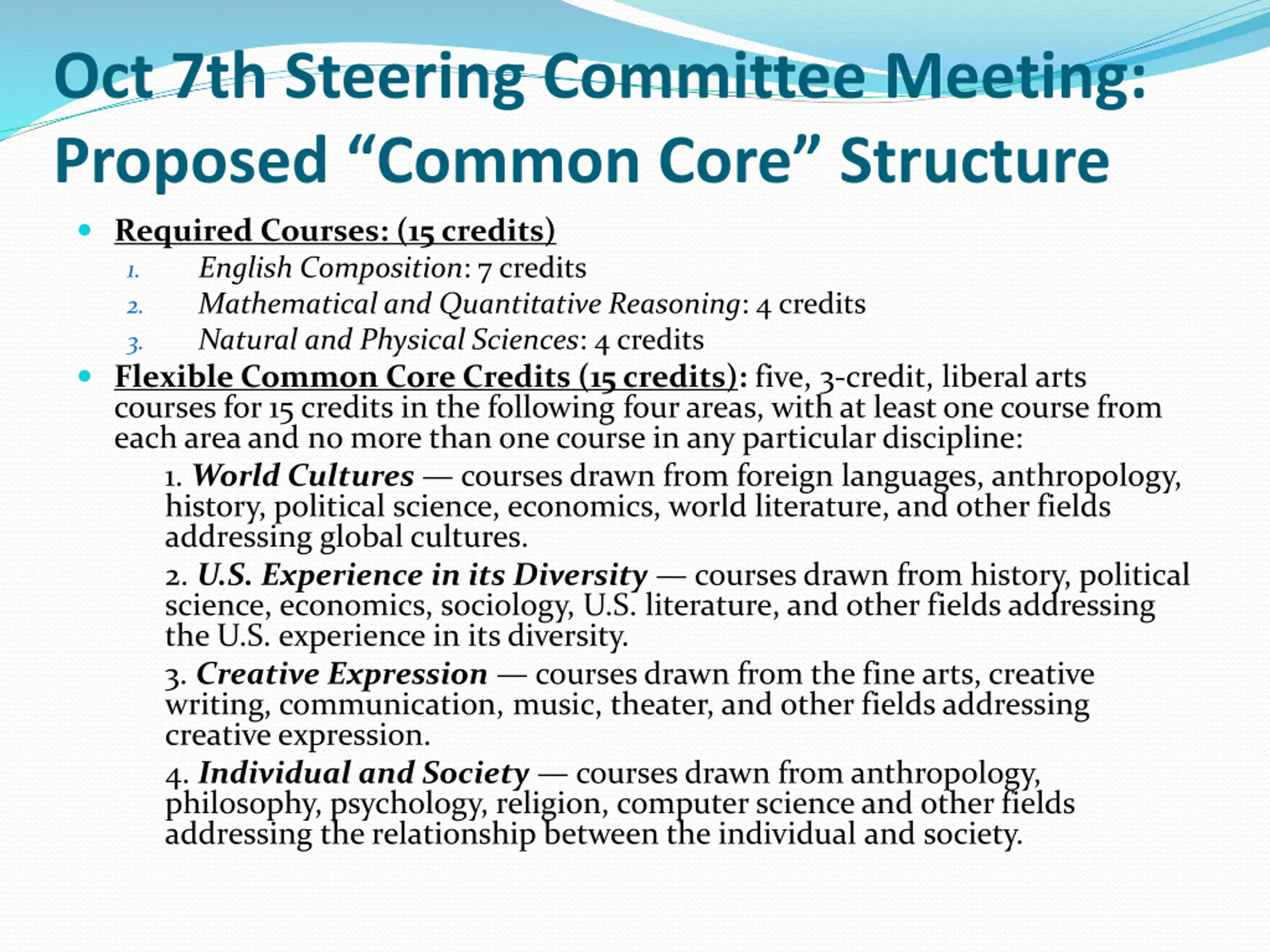 Oct 7th Steering Committee Meeting: Proposed Common Core Structure Required Courses: (15 credits) 1. English Composition: 7 credits 2. Mathematical and Quantitative Reasoning: 4 credits 3. Natural and Physical Sciences: 4 credits Flexible Common Core Credits (15 credits): five, 3-credit, liberal arts courses for 15 credits in the following four areas, with at least one course from each area and no more than one course in any particular discipline: 1. World Cultures courses drawn from foreign languages, anthropology, history, political science, economics, world literature, and other fields addressing global cultures. 2. U.S. Experience in its Diversity courses drawn from history, political science, economics, sociology, U.S. literature, and other fields addressing the U.S. experience in its diversity. 3. Creative Expression courses drawn from the fine arts, creative writing, communication, music, theater, and other fields addressing creative expression. 4. Individual and Society courses drawn from anthropology, philosophy, psychology, religion, computer science and other fields addressing the relationship between the individual and society.