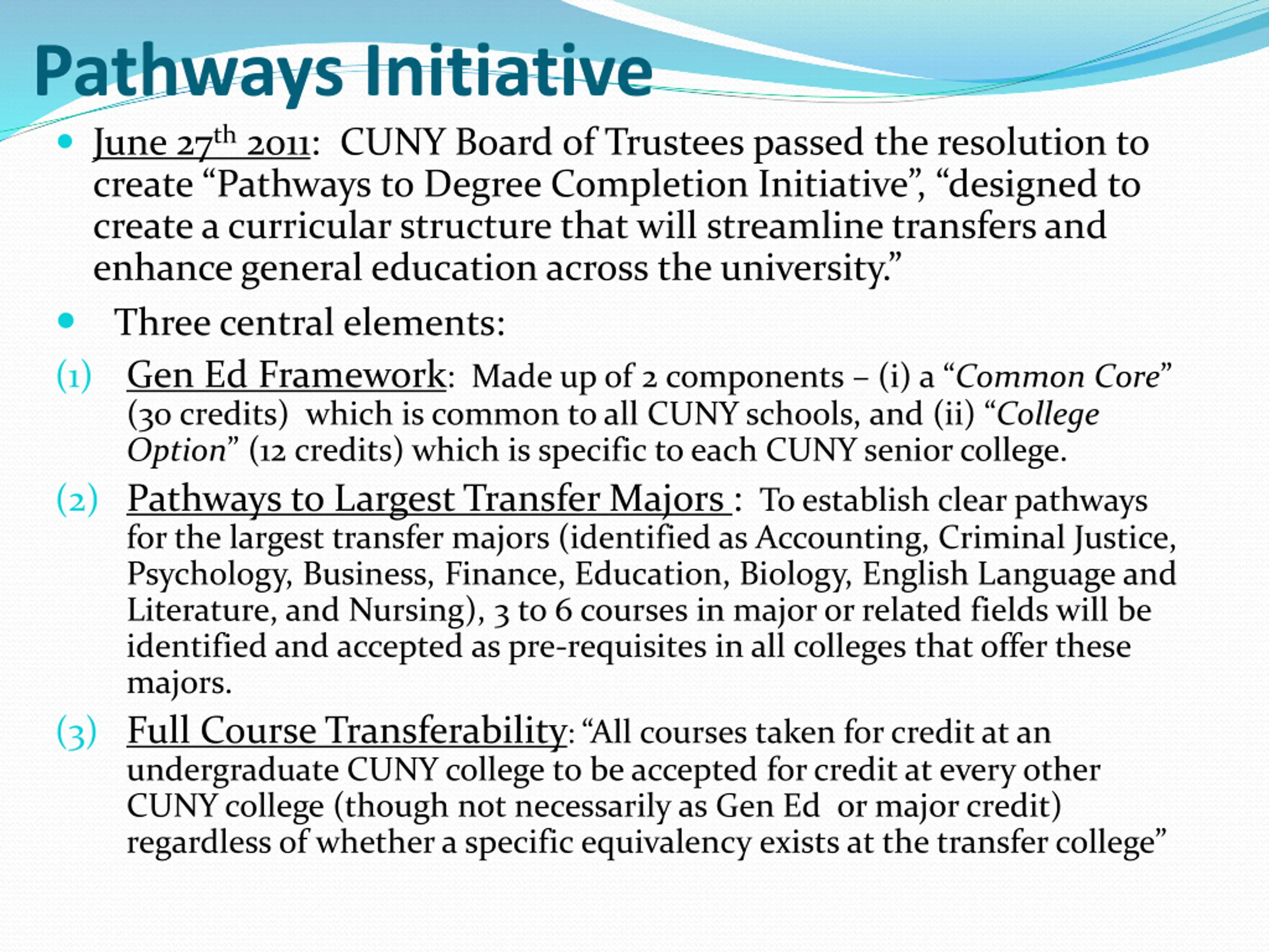 Pathways Initiative June 27th2011: CUNY Board of Trustees passed the resolution to create Pathways to Degree Completion Initiative , designed to create a curricular structure that will streamline transfers and enhance general education across the university. Three central elements: (1) Gen Ed Framework: Made up of 2 components (i) a Common Core (30 credits) which is common to all CUNY schools, and (ii) College Option (12 credits) which is specific to each CUNY senior college. (2) Pathways to Largest Transfer Majors : To establish clear pathways for the largest transfer majors (identified as Accounting, Criminal Justice, Psychology, Business, Finance, Education, Biology, English Language and Literature, and Nursing), 3 to 6 courses in major or related fields will be identified and accepted as pre-requisites in all colleges that offer these majors. (3) Full Course Transferability: All courses taken for credit at an undergraduate CUNY college to be accepted for credit at every other CUNY college (though not necessarily as Gen Ed or major credit) regardless of whether a specific equivalency exists at the transfer college