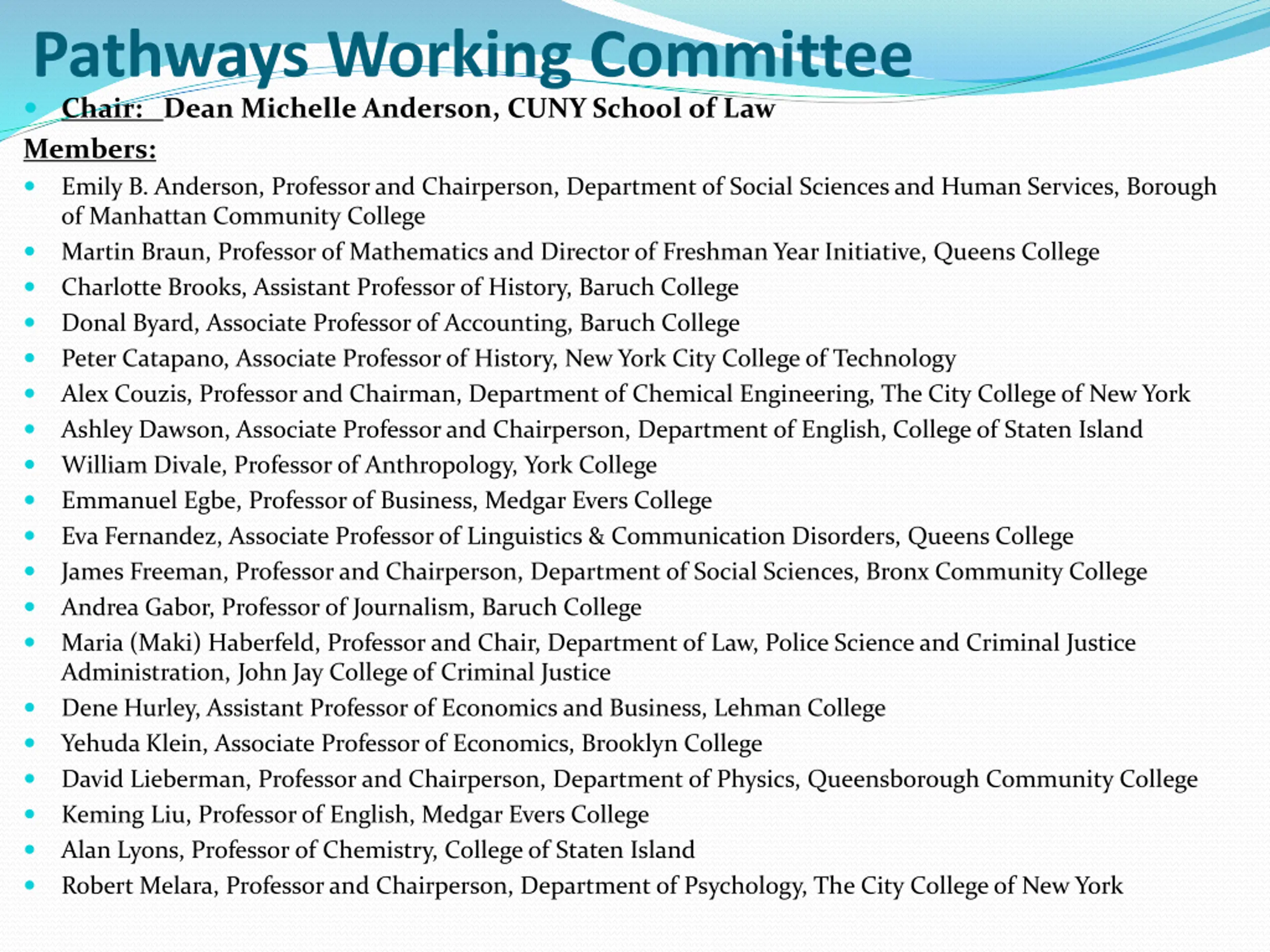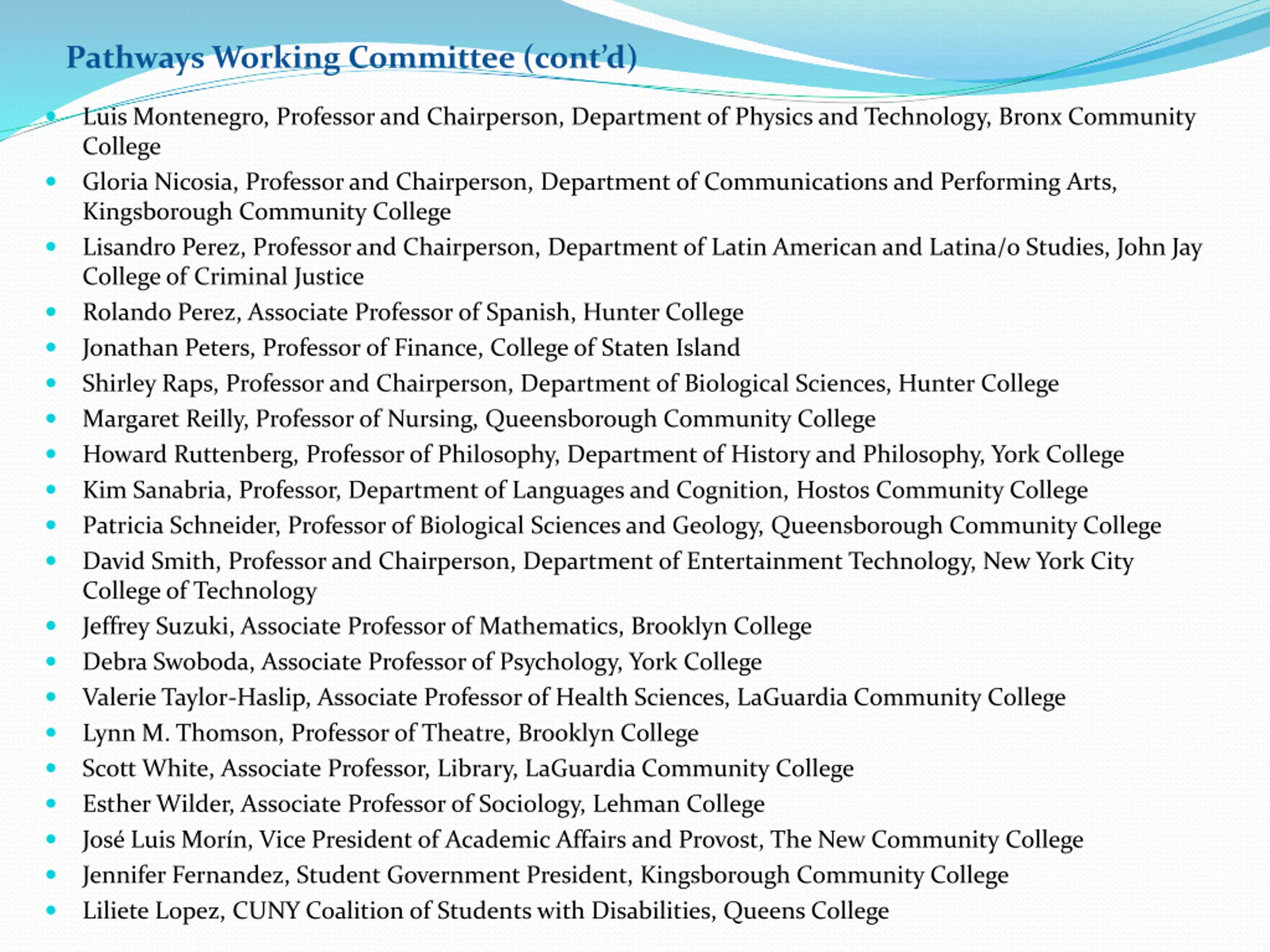 Pathways Working Committee (contd) Luis Montenegro, Professor and Chairperson, Department of Physics and Technology, Bronx Community College Gloria Nicosia, Professor and Chairperson, Department of Communications and Performing Arts, Kingsborough Community College Lisandro Perez, Professor and Chairperson, Department of Latin American and Latina/o Studies, John Jay College of Criminal Justice Rolando Perez, Associate Professor of Spanish, Hunter College Jonathan Peters, Professor of Finance, College of Staten Island Shirley Raps, Professor and Chairperson, Department of Biological Sciences, Hunter College Margaret Reilly, Professor of Nursing, Queensborough Community College Howard Ruttenberg, Professor of Philosophy, Department of History and Philosophy, York College Kim Sanabria, Professor, Department of Languages and Cognition, Hostos Community College Patricia Schneider, Professor of Biological Sciences and Geology, Queensborough Community College David Smith, Professor and Chairperson, Department of Entertainment Technology, New York City College of Technology Jeffrey Suzuki, Associate Professor of Mathematics, Brooklyn College Debra Swoboda, Associate Professor of Psychology, York College Valerie Taylor-Haslip, Associate Professor of Health Sciences, LaGuardia Community College Lynn M. Thomson, Professor of Theatre, Brooklyn College Scott White, Associate Professor, Library, LaGuardia Community College Esther Wilder, Associate Professor of Sociology, Lehman College Jos Luis Mor n, Vice President of Academic Affairs and Provost, The New Community College Jennifer Fernandez, Student Government President, Kingsborough Community College Liliete Lopez, CUNY Coalition of Students with Disabilities, Queens College