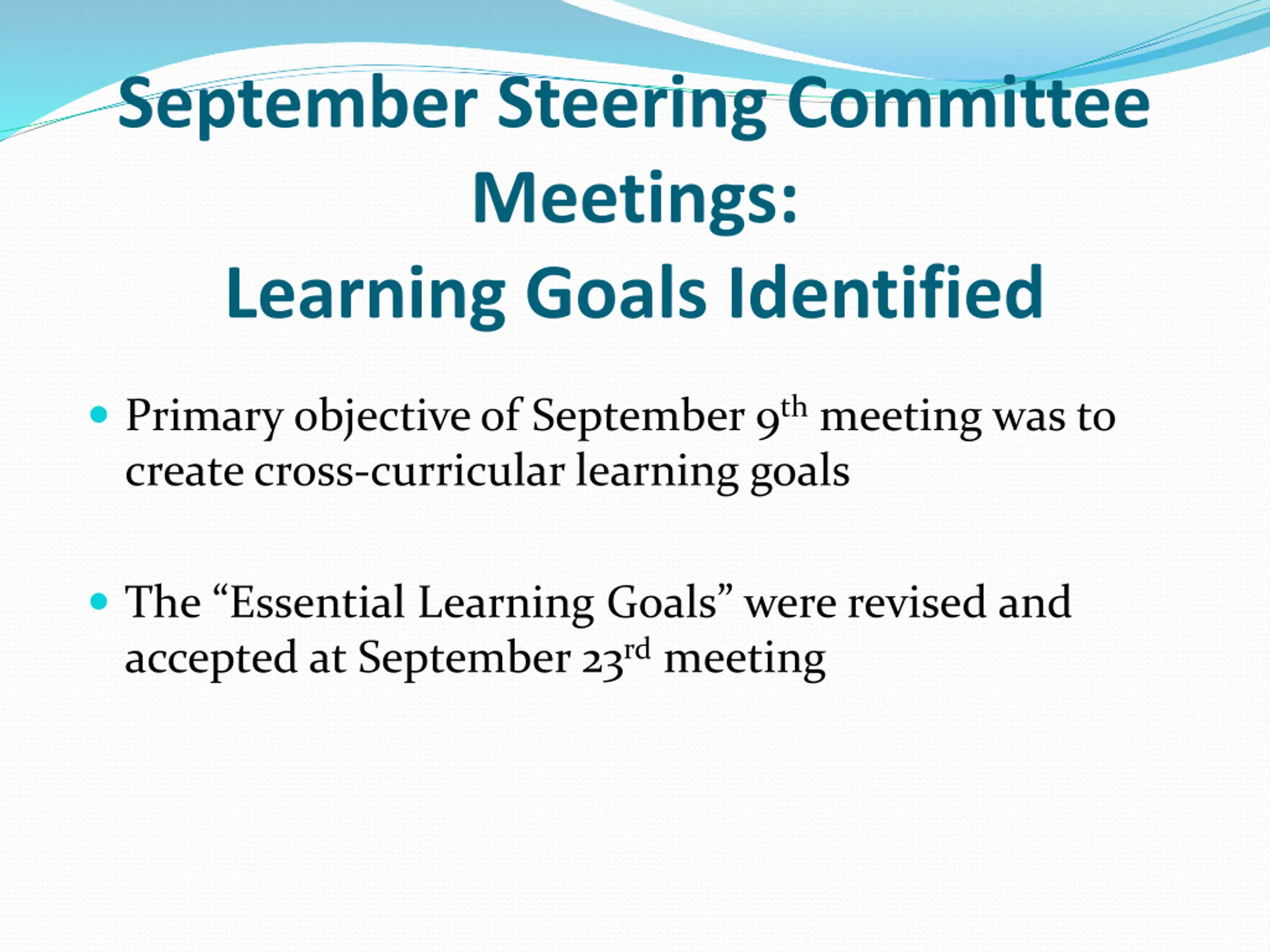 September Steering Committee Meetings: Learning Goals Identified Primary objective of September 9th meeting was to create cross-curricular learning goals The Essential Learning Goals were revised and accepted at September 23rd meeting