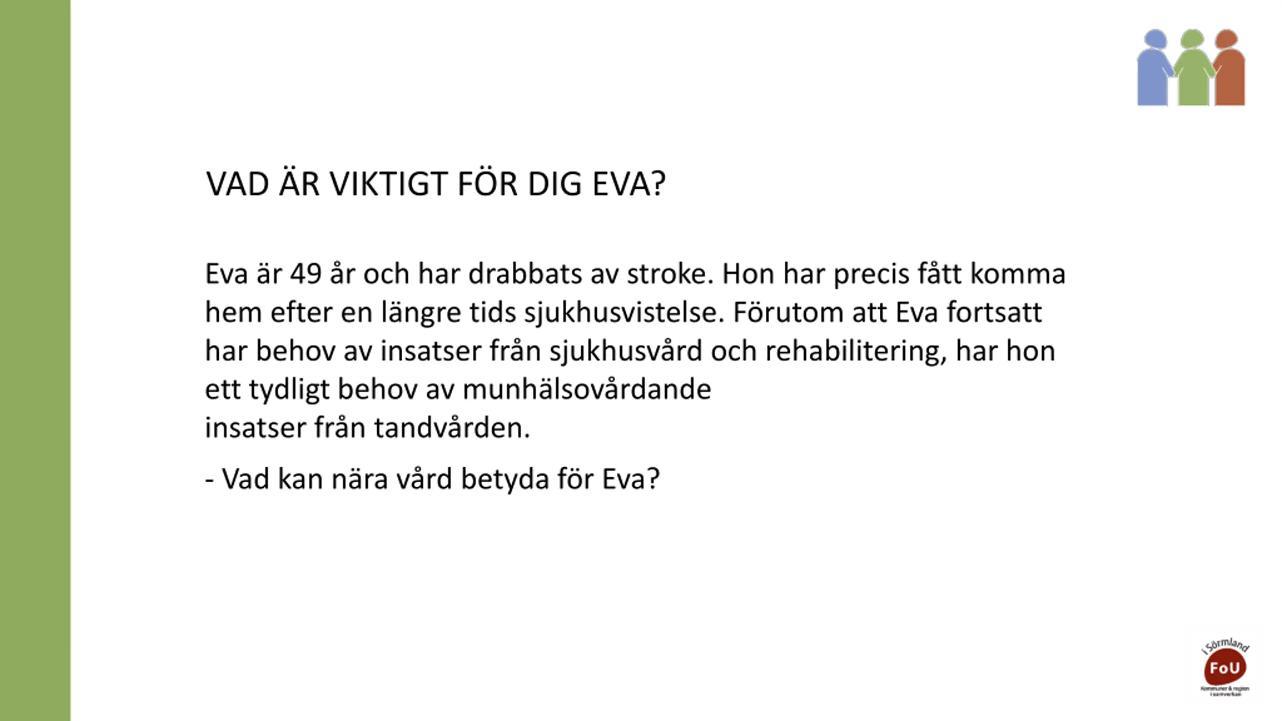 VAD R VIKTIGT FR DIG EVA? Eva r 49 r och har drabbats av stroke. Hon har precis f tt komma hem efter en l ngre tids sjukhusvistelse. F rutom att Eva fortsatt har behov av insatser fr n sjukhusv rd och rehabilitering, har hon ett tydligt behov av munh lsov rdande insatser fr n tandv rden. - Vad kan n ra v rd betyda f r Eva?