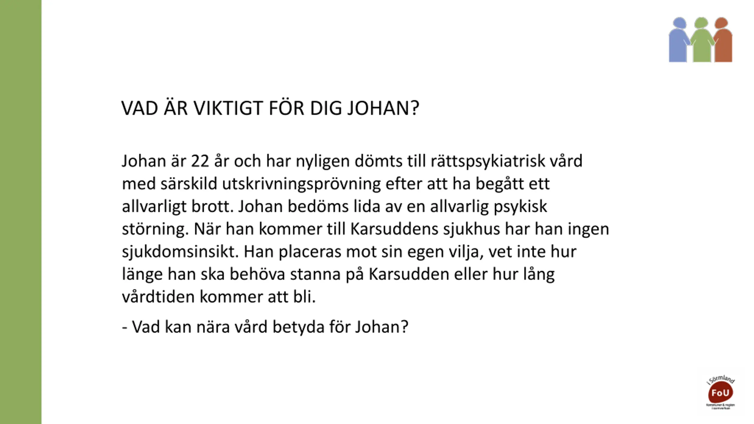 VAD R VIKTIGT FR DIG JOHAN? Johan r 22 r och har nyligen d mts till r ttspsykiatrisk v rd med s rskild utskrivningspr vning efter att ha beg tt ett allvarligt brott. Johan bed ms lida av en allvarlig psykisk st rning. N r han kommer till Karsuddens sjukhus har han ingen sjukdomsinsikt. Han placeras mot sin egen vilja, vet inte hur l nge han ska beh va stanna p Karsudden eller hur l ng v rdtiden kommer att bli. - Vad kan n ra v rd betyda f r Johan?