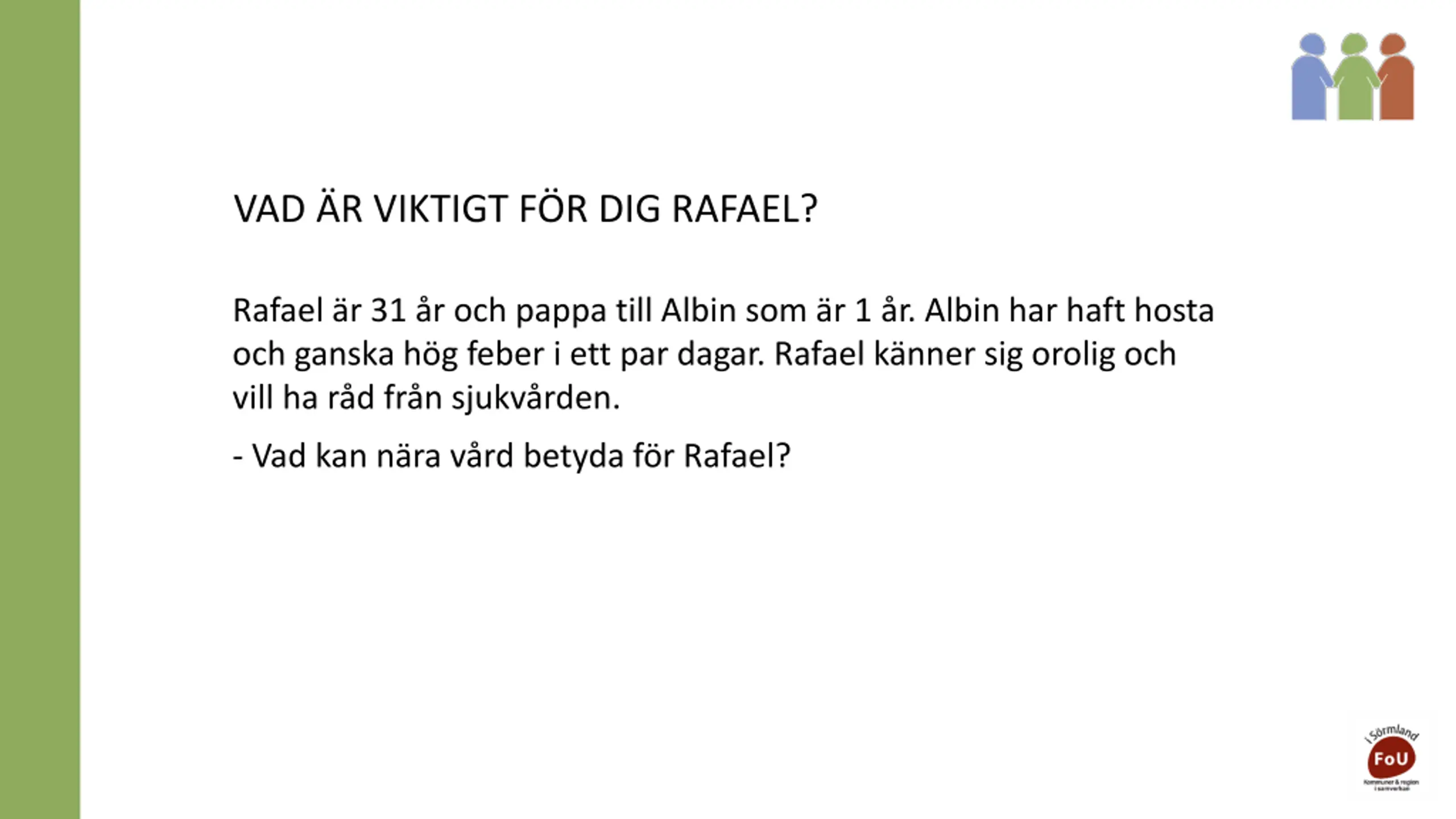 VAD R VIKTIGT FR DIG RAFAEL? Rafael r 31 r och pappa till Albin som r 1 r. Albin har haft hosta och ganska h g feber i ett par dagar. Rafael k nner sig orolig och vill ha r d fr n sjukv rden. - Vad kan n ra v rd betyda f r Rafael?