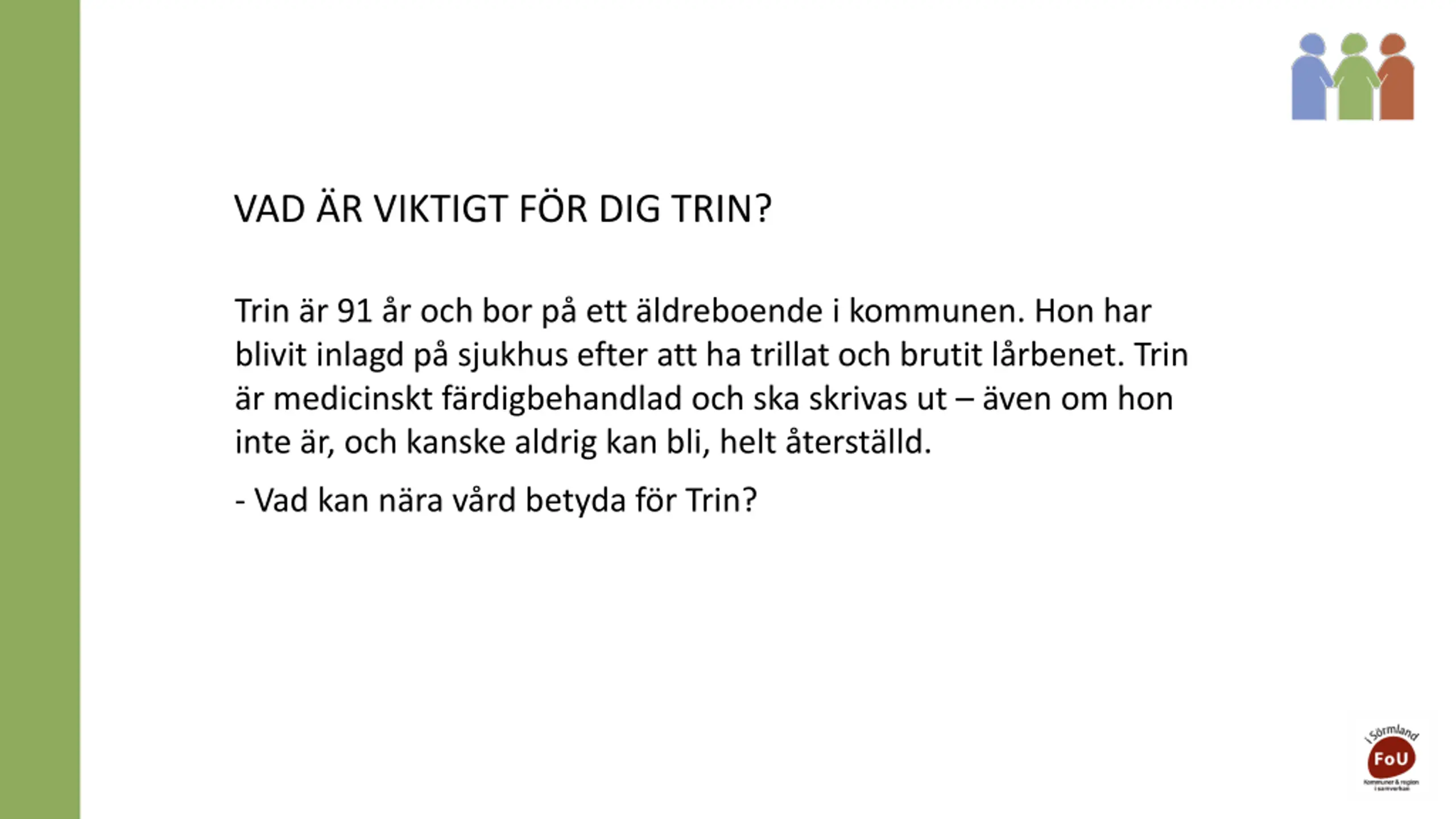 VAD R VIKTIGT FR DIG TRIN? Trin r 91 r och bor p ett ldreboende i kommunen. Hon har blivit inlagd p sjukhus efter att ha trillat och brutit l rbenet. Trin r medicinskt f rdigbehandlad och ska skrivas ut ven om hon inte r, och kanske aldrig kan bli, helt terst lld. - Vad kan n ra v rd betyda f r Trin?
