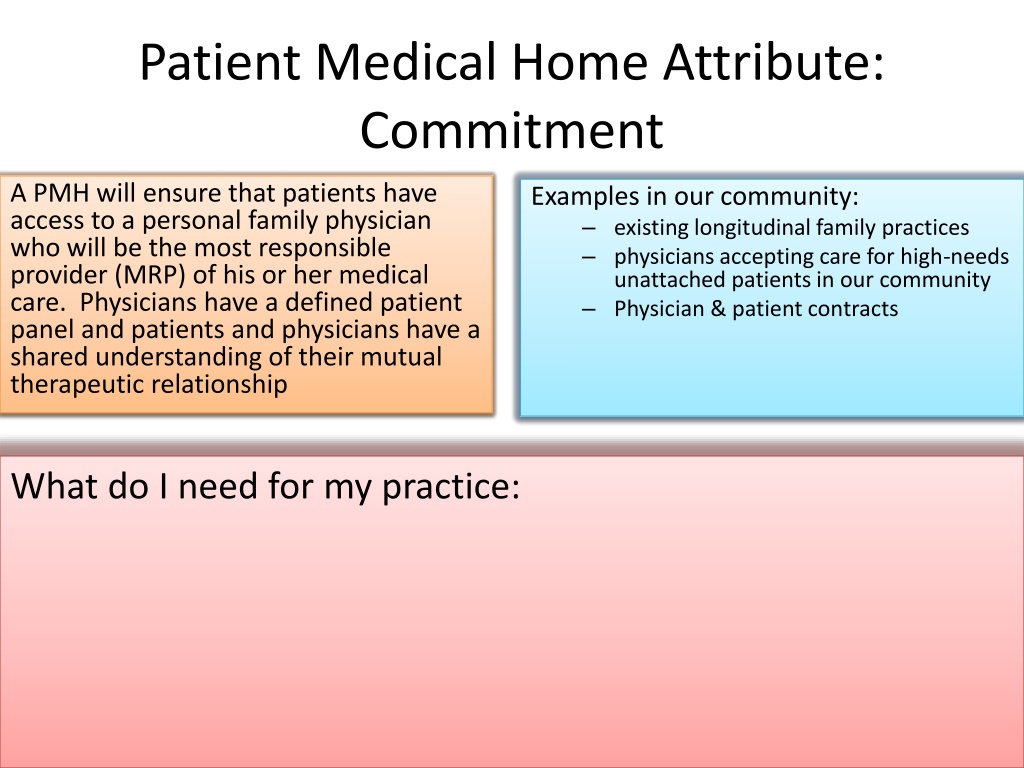 Patient Medical Home Attribute: Commitment A PMH will ensure that patients have access to a personal family physician who will be the most responsible provider (MRP) of his or her medical care. Physicians have a defined patient panel and patients and physicians have a shared understanding of their mutual therapeutic relationship Examples in our community: existing longitudinal family practices physicians accepting care for high-needs unattached patients in our community Physician & patient contracts What do I need for my practice: