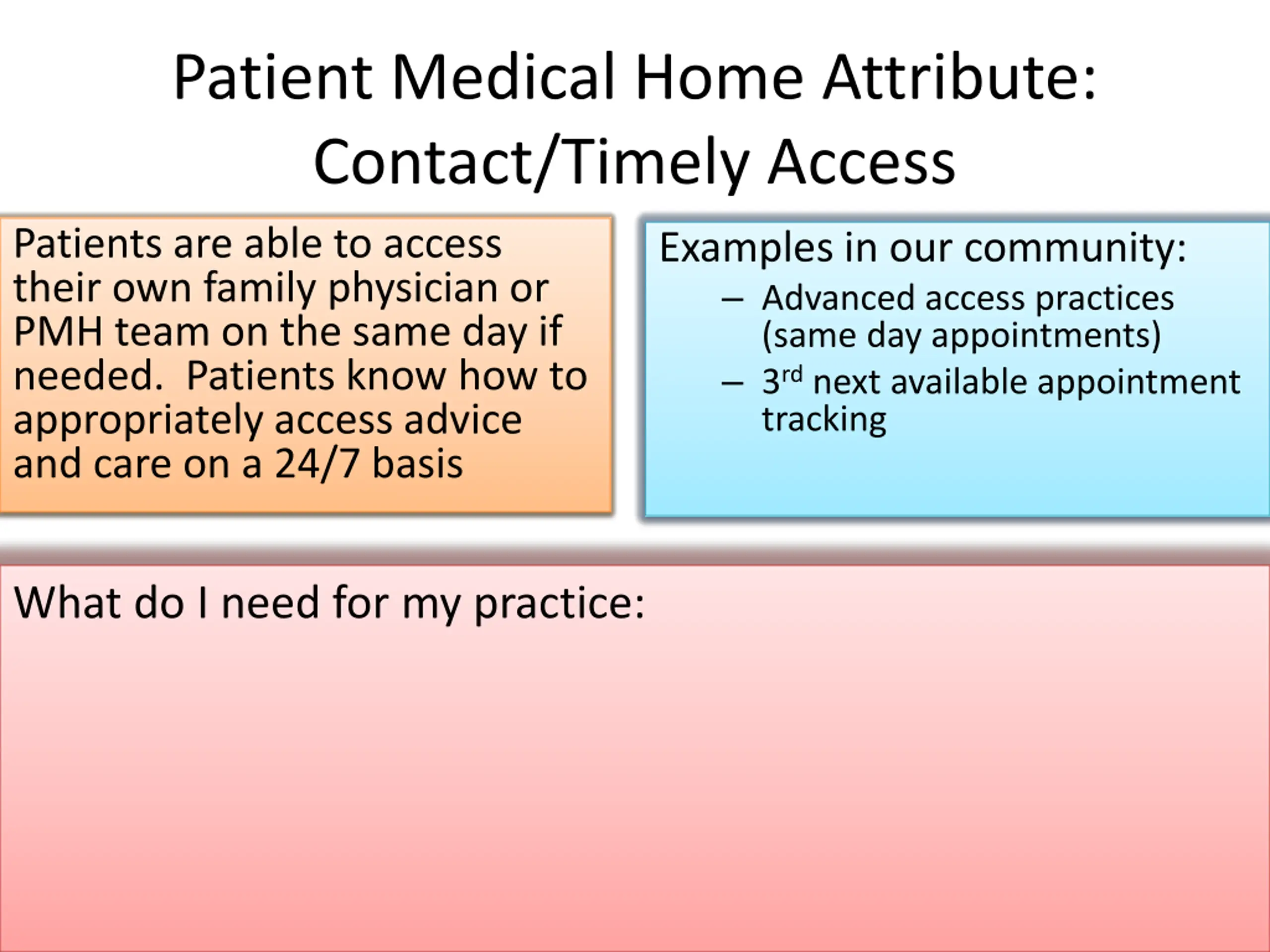 Patient Medical Home Attribute: Contact/Timely Access Patients are able to access their own family physician or PMH team on the same day if needed. Patients know how to appropriately access advice and care on a 24/7 basis Examples in our community: Advanced access practices (same day appointments) 3rd next available appointment tracking What do I need for my practice:
