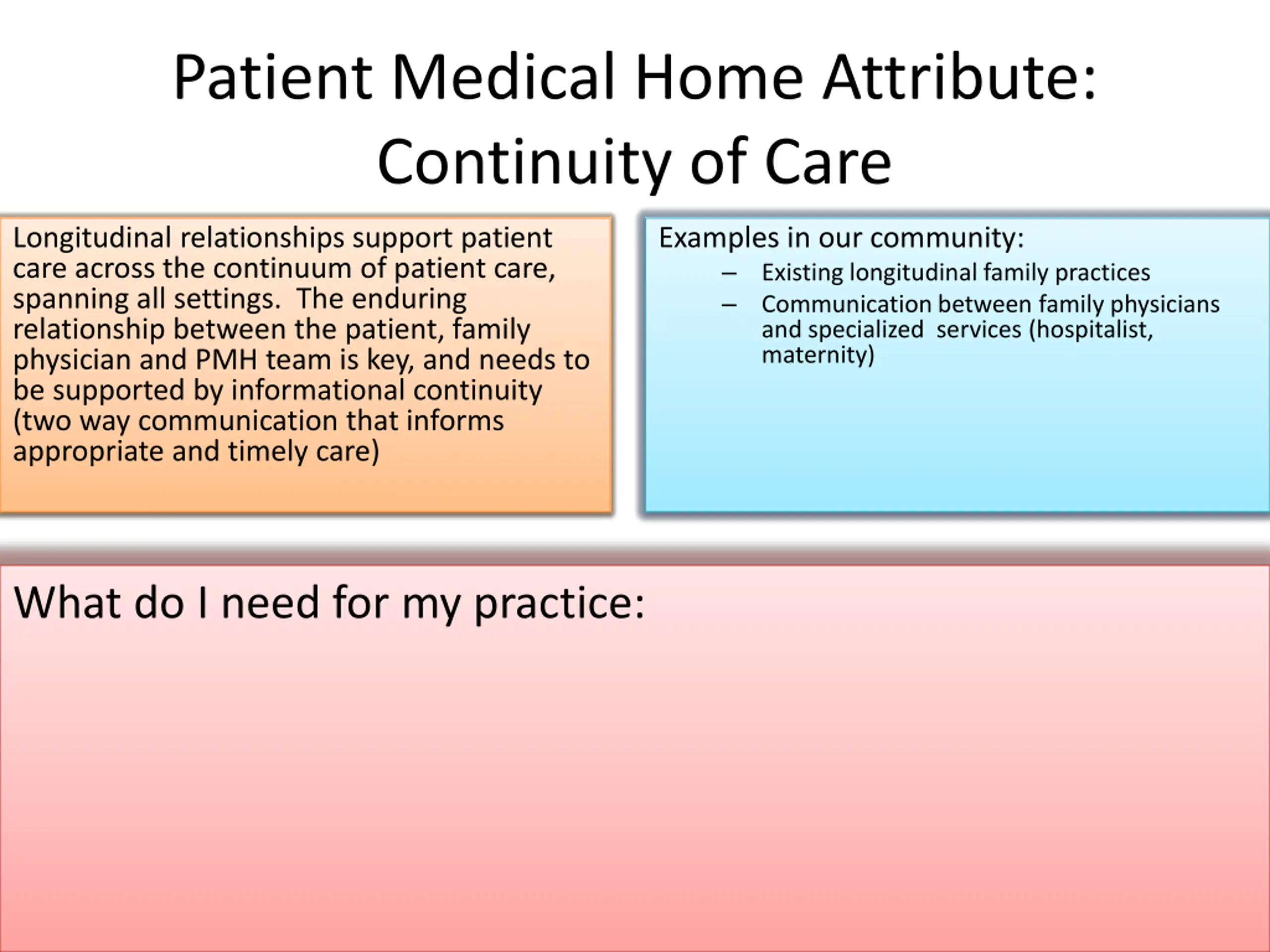 Patient Medical Home Attribute: Continuity of Care Longitudinal relationships support patient care across the continuum of patient care, spanning all settings. The enduring relationship between the patient, family physician and PMH team is key, and needs to be supported by informational continuity (two way communication that informs appropriate and timely care) Examples in our community: Existing longitudinal family practices Communication between family physicians and specialized services (hospitalist, maternity) What do I need for my practice: