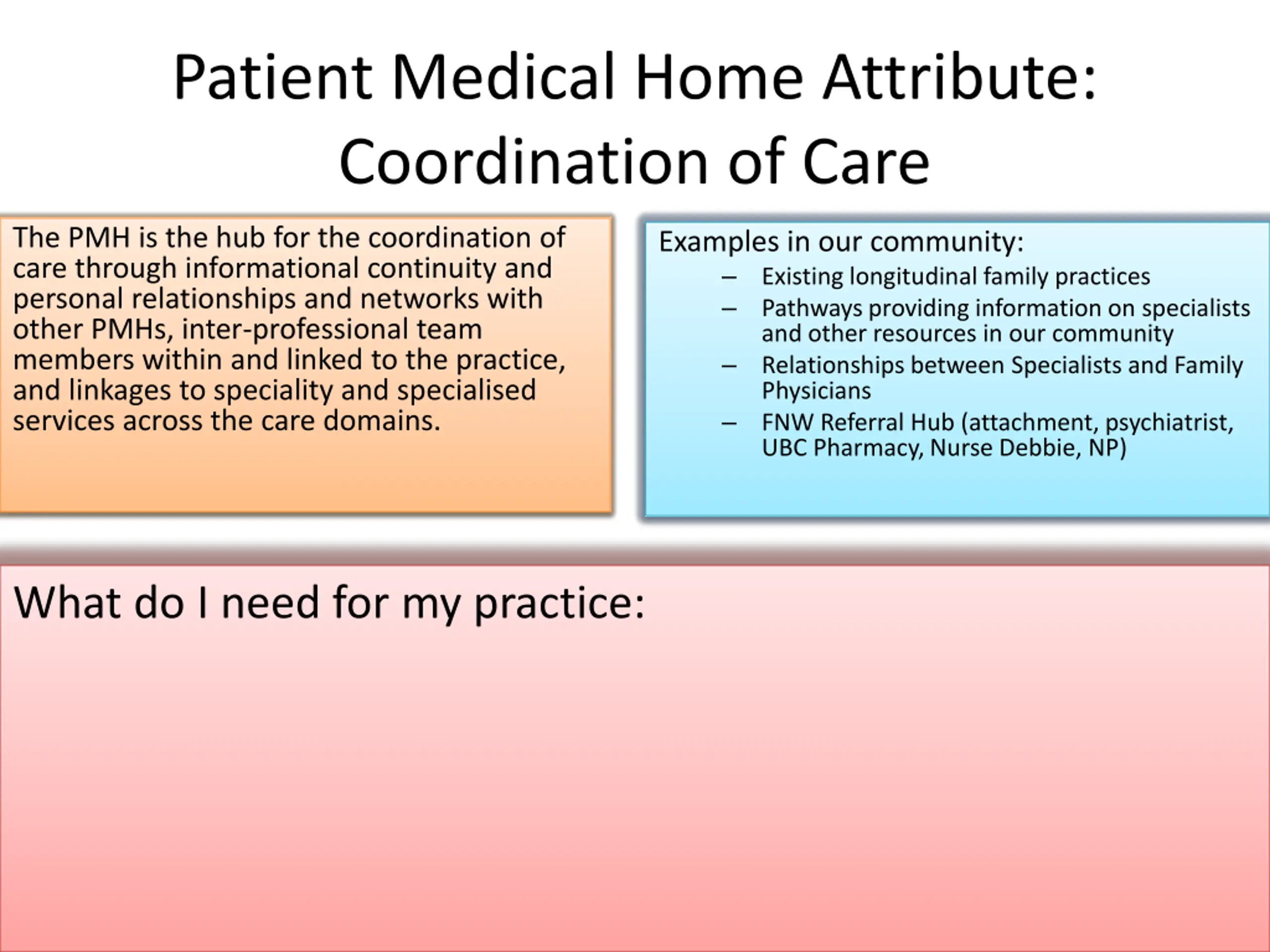 Patient Medical Home Attribute: Coordination of Care The PMH is the hub for the coordination of care through informational continuity and personal relationships and networks with other PMHs, inter-professional team members within and linked to the practice, and linkages to speciality and specialised services across the care domains. Examples in our community: Existing longitudinal family practices Pathways providing information on specialists and other resources in our community Relationships between Specialists and Family Physicians FNW Referral Hub (attachment, psychiatrist, UBC Pharmacy, Nurse Debbie, NP) What do I need for my practice: