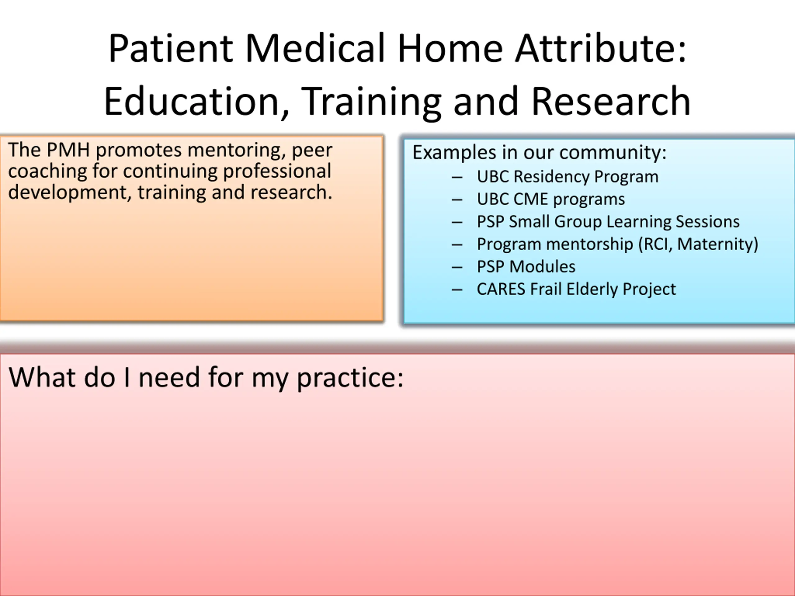 Patient Medical Home Attribute: Education, Training and Research The PMH promotes mentoring, peer coaching for continuing professional development, training and research. Examples in our community: UBC Residency Program UBC CME programs PSP Small Group Learning Sessions Program mentorship (RCI, Maternity) PSP Modules CARES Frail Elderly Project What do I need for my practice: