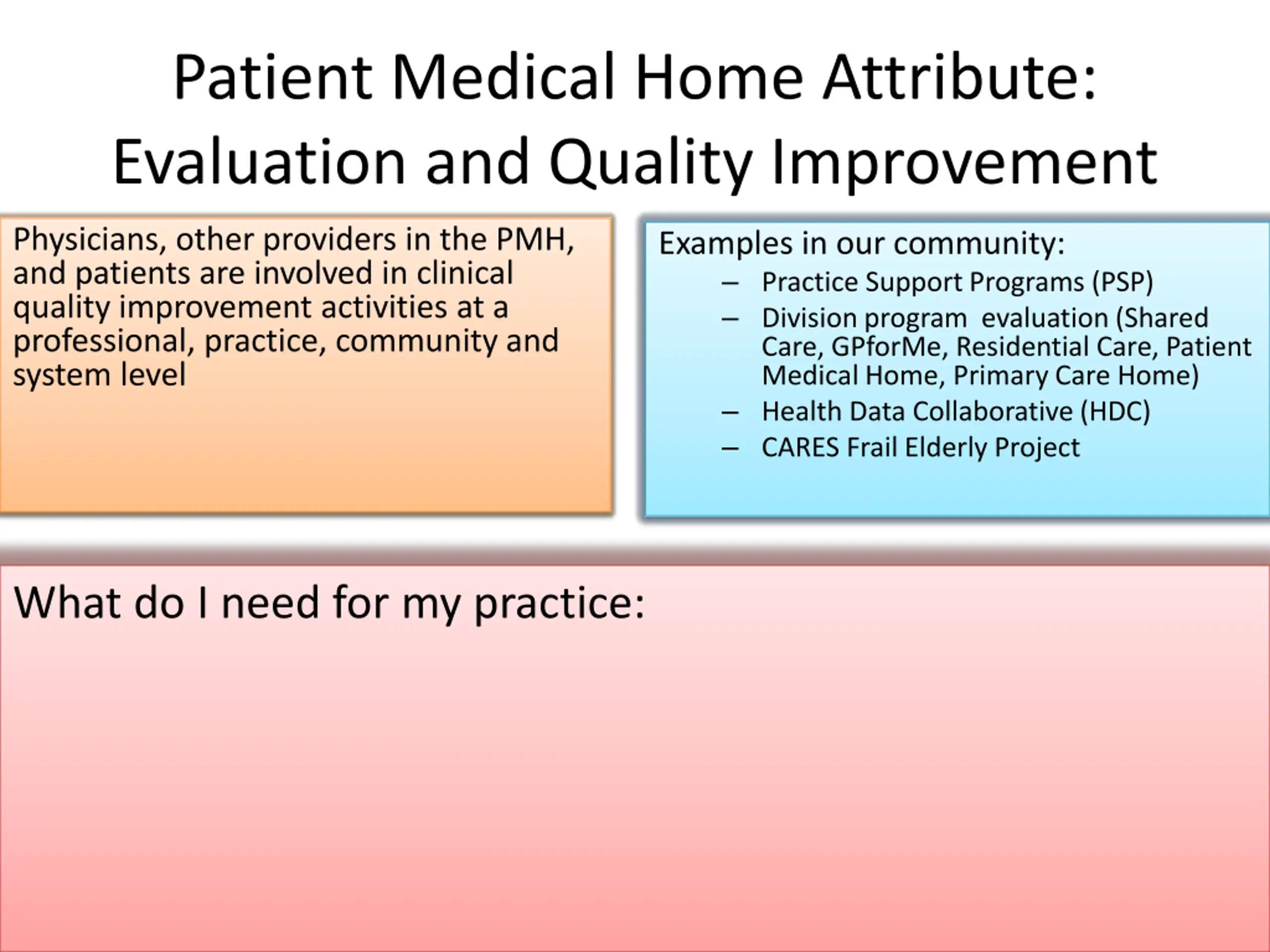 Patient Medical Home Attribute: Evaluation and Quality Improvement Physicians, other providers in the PMH, and patients are involved in clinical quality improvement activities at a professional, practice, community and system level Examples in our community: Practice Support Programs (PSP) Division program evaluation (Shared Care, GPforMe, Residential Care, Patient Medical Home, Primary Care Home) Health Data Collaborative (HDC) CARES Frail Elderly Project What do I need for my practice: