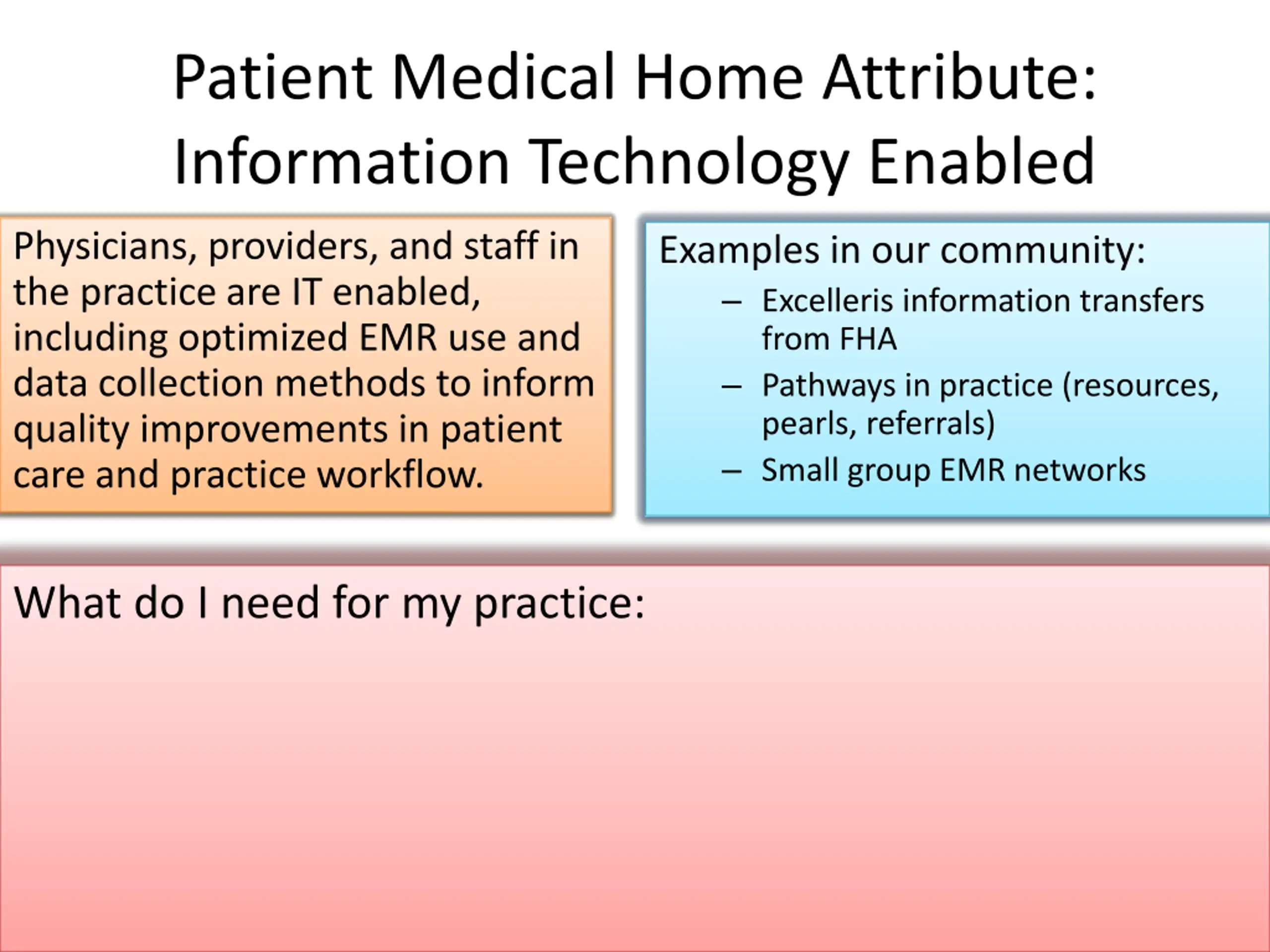 Patient Medical Home Attribute: Information Technology Enabled Physicians, providers, and staff in the practice are IT enabled, including optimized EMR use and data collection methods to inform quality improvements in patient care and practice workflow. Examples in our community: Excelleris information transfers from FHA Pathways in practice (resources, pearls, referrals) Small group EMR networks What do I need for my practice: