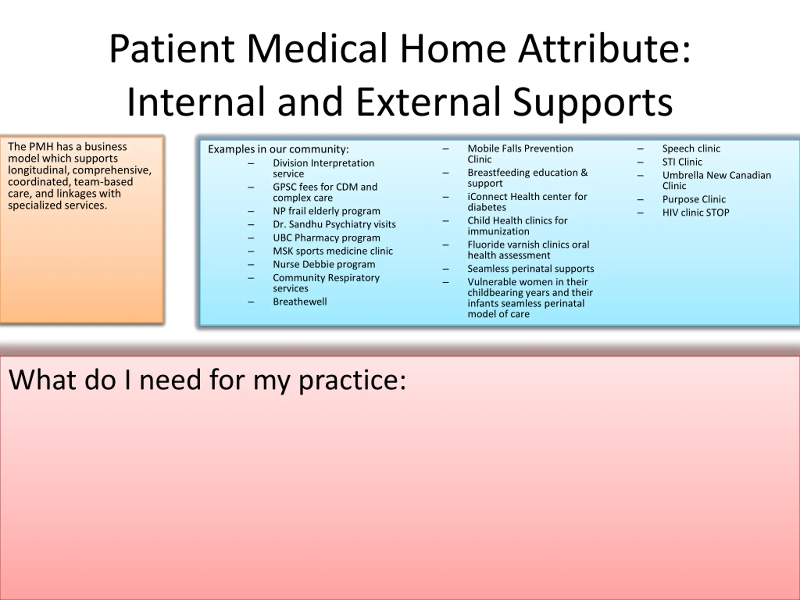 Patient Medical Home Attribute: Internal and External Supports The PMH has a business model which supports longitudinal, comprehensive, coordinated, team-based care, and linkages with specialized services. Examples in our community: Division Interpretation service GPSC fees for CDM and complex care NP frail elderly program Dr. Sandhu Psychiatry visits UBC Pharmacy program MSK sports medicine clinic Nurse Debbie program Community Respiratory services Breathewell Mobile Falls Prevention Clinic Breastfeeding education & support iConnect Health center for diabetes Child Health clinics for immunization Fluoride varnish clinics oral health assessment Seamless perinatal supports Vulnerable women in their childbearing years and their infants seamless perinatal model of care Speech clinic STI Clinic Umbrella New Canadian Clinic Purpose Clinic HIV clinic STOP What do I need for my practice: