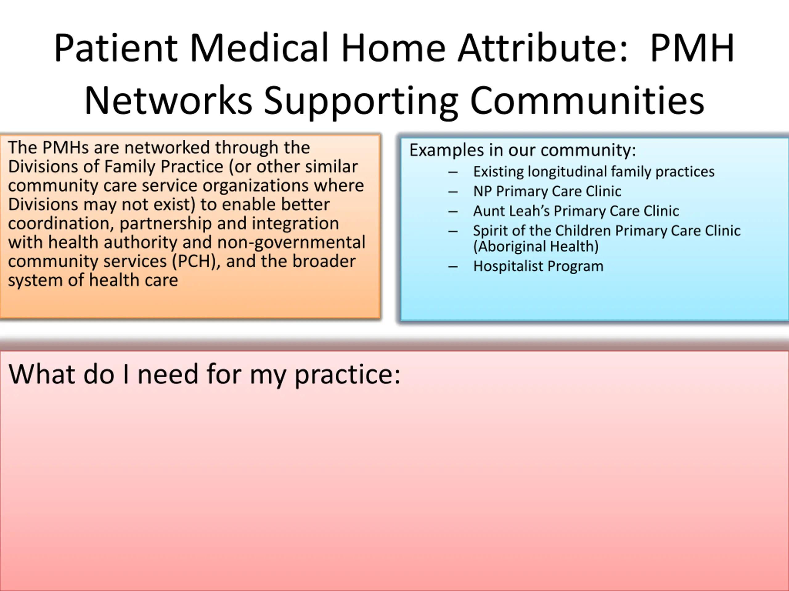 Patient Medical Home Attribute: PMH Networks Supporting Communities The PMHs are networked through the Divisions of Family Practice (or other similar community care service organizations where Divisions may not exist) to enable better coordination, partnership and integration with health authority and non-governmental community services (PCH), and the broader system of health care Examples in our community: Existing longitudinal family practices NP Primary Care Clinic Aunt Leah s Primary Care Clinic Spirit of the Children Primary Care Clinic (Aboriginal Health) Hospitalist Program What do I need for my practice: