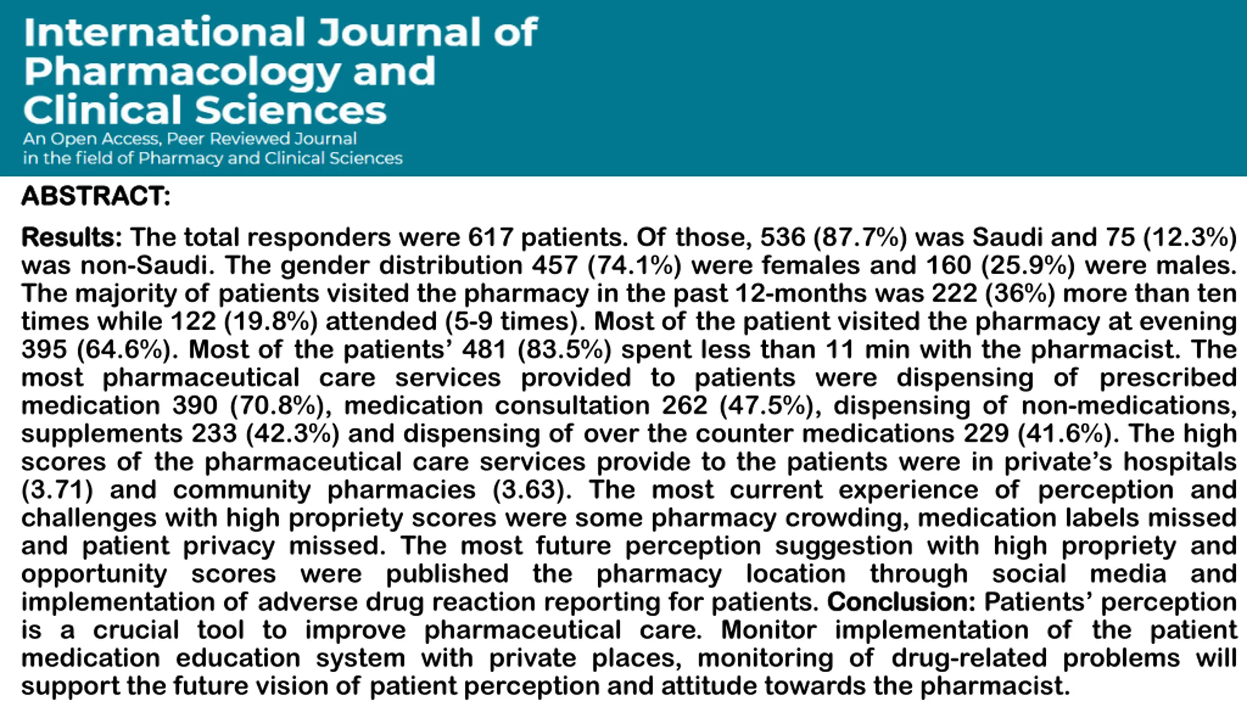 ABSTRACT: ABSTRACT: Results Results: : The total responders were 617 patients. Of those, 536 (87.7%) was Saudi and 75 (12.3%) was non-Saudi. The gender distribution 457 (74.1%) were females and 160 (25.9%) were males. The majority of patients visited the pharmacy in the past 12-months was 222 (36%) more than ten times while 122 (19.8%) attended (5-9 times). Most of the patient visited the pharmacy at evening 395 (64.6%). Most of the patients 481 (83.5%) spent less than 11 min with the pharmacist. The most pharmaceutical care services provided to patients were dispensing of prescribed medication 390 (70.8%), medication consultation 262 (47.5%), dispensing of non-medications, supplements 233 (42.3%) and dispensing of over the counter medications 229 (41.6%). The high scores of the pharmaceutical care services provide to the patients were in private s hospitals (3.71) and community pharmacies (3.63). The most current experience of perception and challenges with high propriety scores were some pharmacy crowding, medication labels missed and patient privacy missed. The most future perception suggestion with high propriety and opportunity scores were published the pharmacy location through social media and implementation of adverse drug reaction reporting for patients. Conclusion is a crucial tool to improve pharmaceutical care. Monitor implementation of the patient medication education system with private places, monitoring of drug-related problems will support the future vision of patient perception and attitude towards the pharmacist. Conclusion: : Patients perception