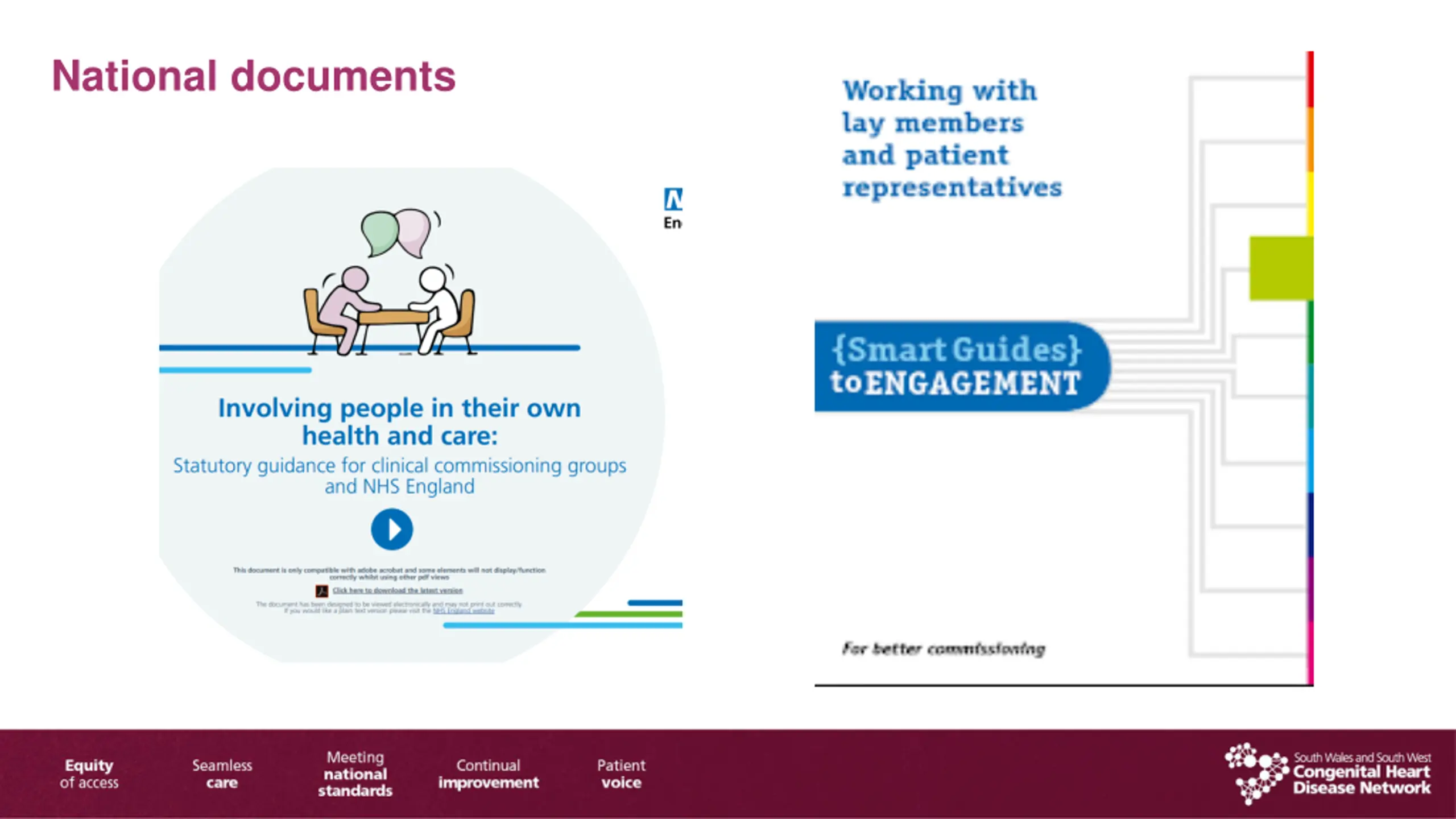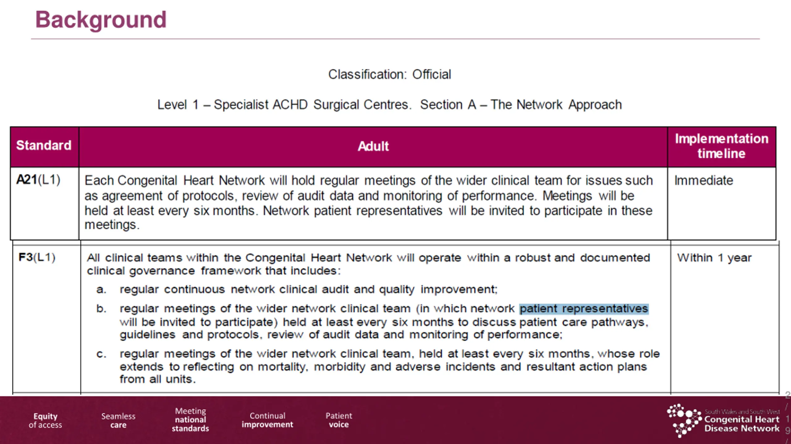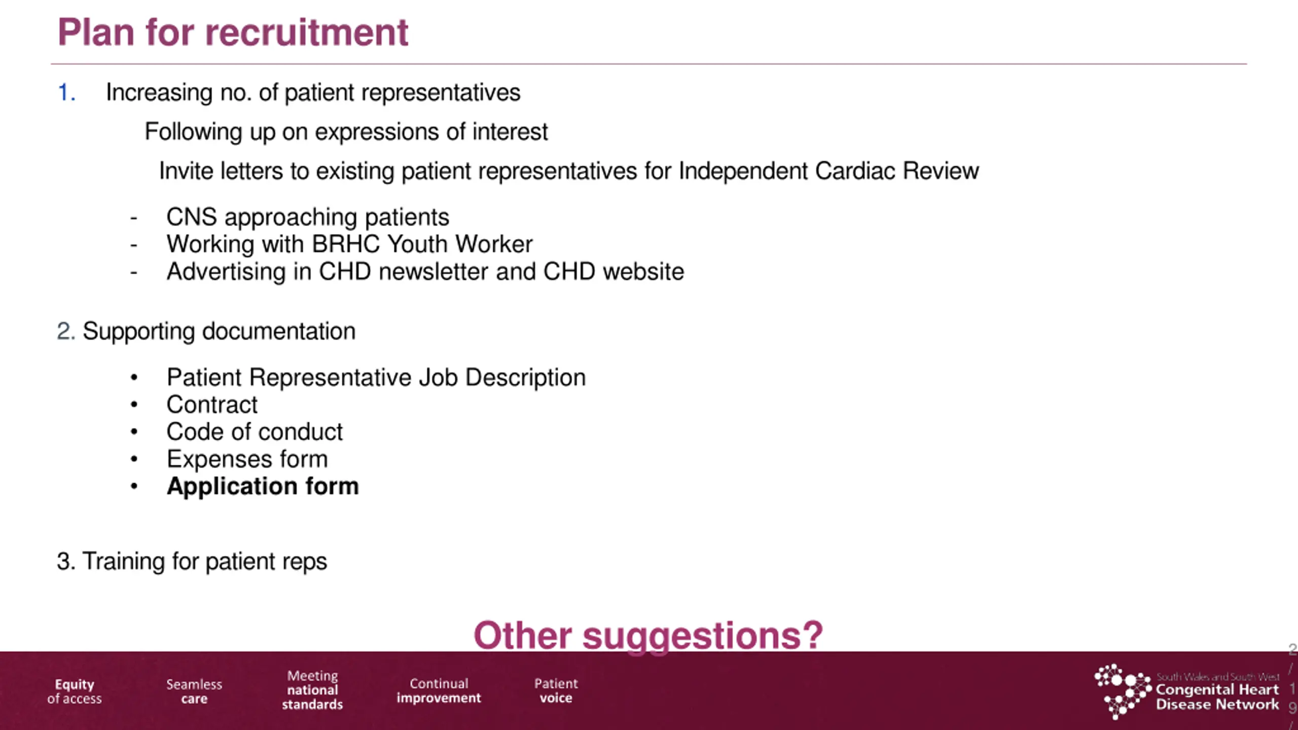 Plan for recruitment 1. Invite letters to existing patient representatives for Independent Cardiac Review Increasing no. of patient representatives Following up on expressions of interest - - - CNS approaching patients Working with BRHC Youth Worker Advertising in CHD newsletter and CHD website 2. Supporting documentation Patient Representative Job Description Contract Code of conduct Expenses form Application form 3. Training for patient reps Other suggestions? 2 / 1 9 / Meeting national standards Continual improvement Patient voice Equity of access Seamless care