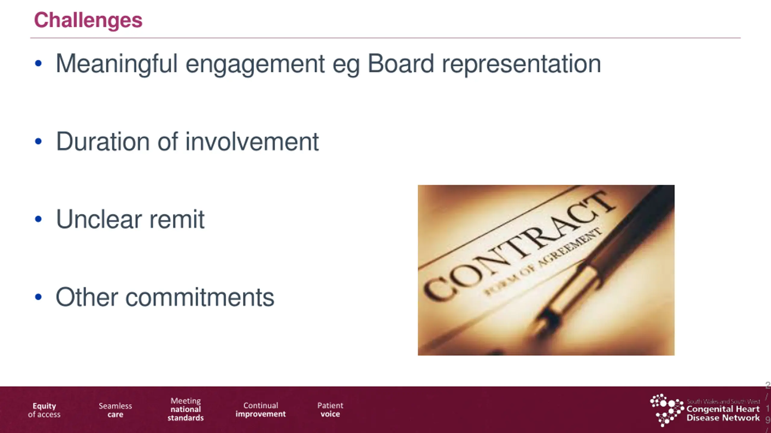Challenges Meaningful engagement eg Board representation Duration of involvement Unclear remit Other commitments 2 / 1 9 / Meeting national standards Continual improvement Patient voice Equity of access Seamless care