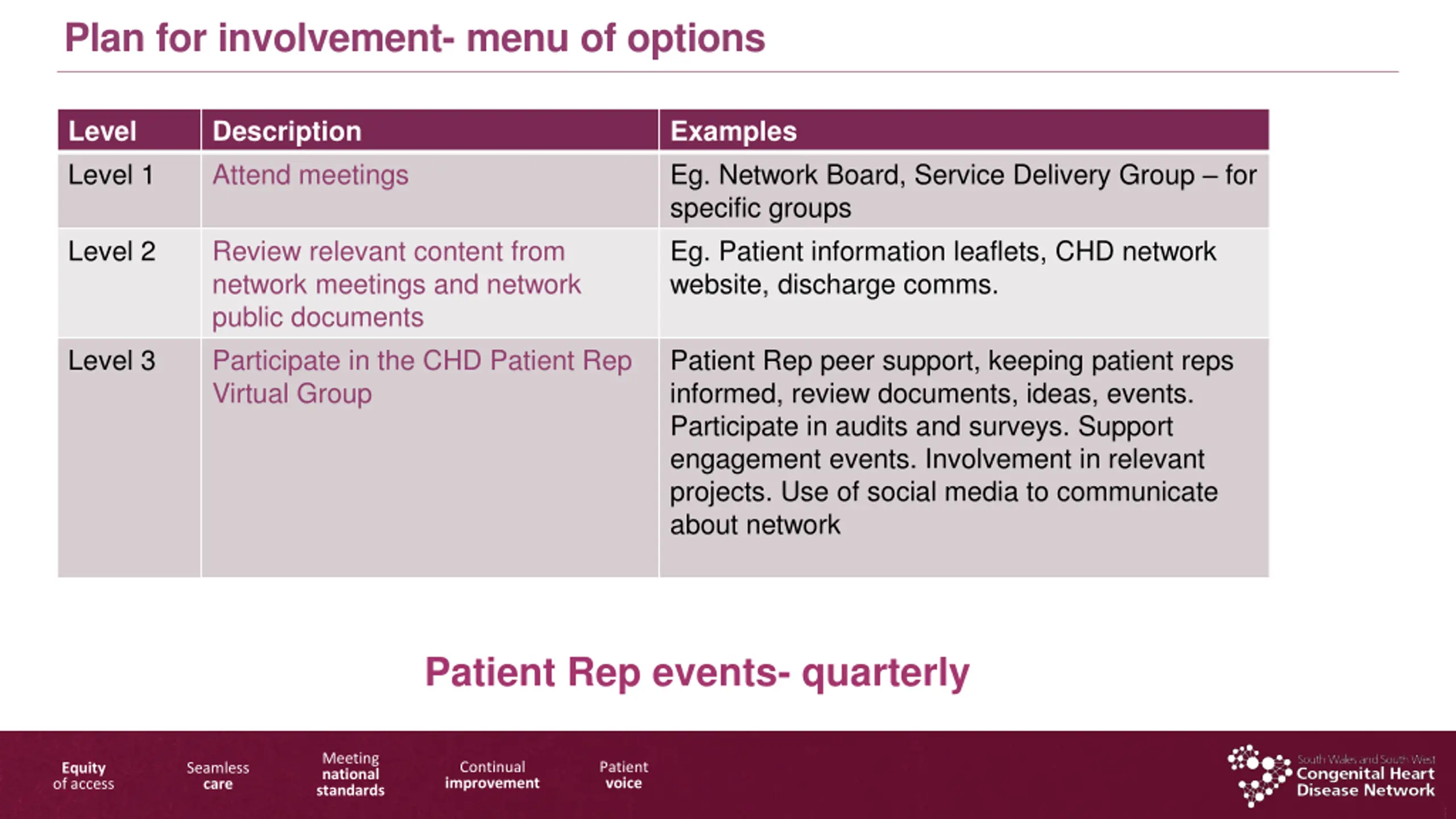 Plan for involvement- menu of options Level Level 1 Description Attend meetings Examples Eg. Network Board, Service Delivery Group for specific groups Eg. Patient information leaflets, CHD network website, discharge comms. Level 2 Review relevant content from network meetings and network public documents Participate in the CHD Patient Rep Virtual Group Level 3 Patient Rep peer support, keeping patient reps informed, review documents, ideas, events. Participate in audits and surveys. Support engagement events. Involvement in relevant projects. Use of social media to communicate about network Patient Rep events- quarterly Meeting national standards Continual improvement Patient voice Equity of access Seamless care 2 / 1 9 / 2 0