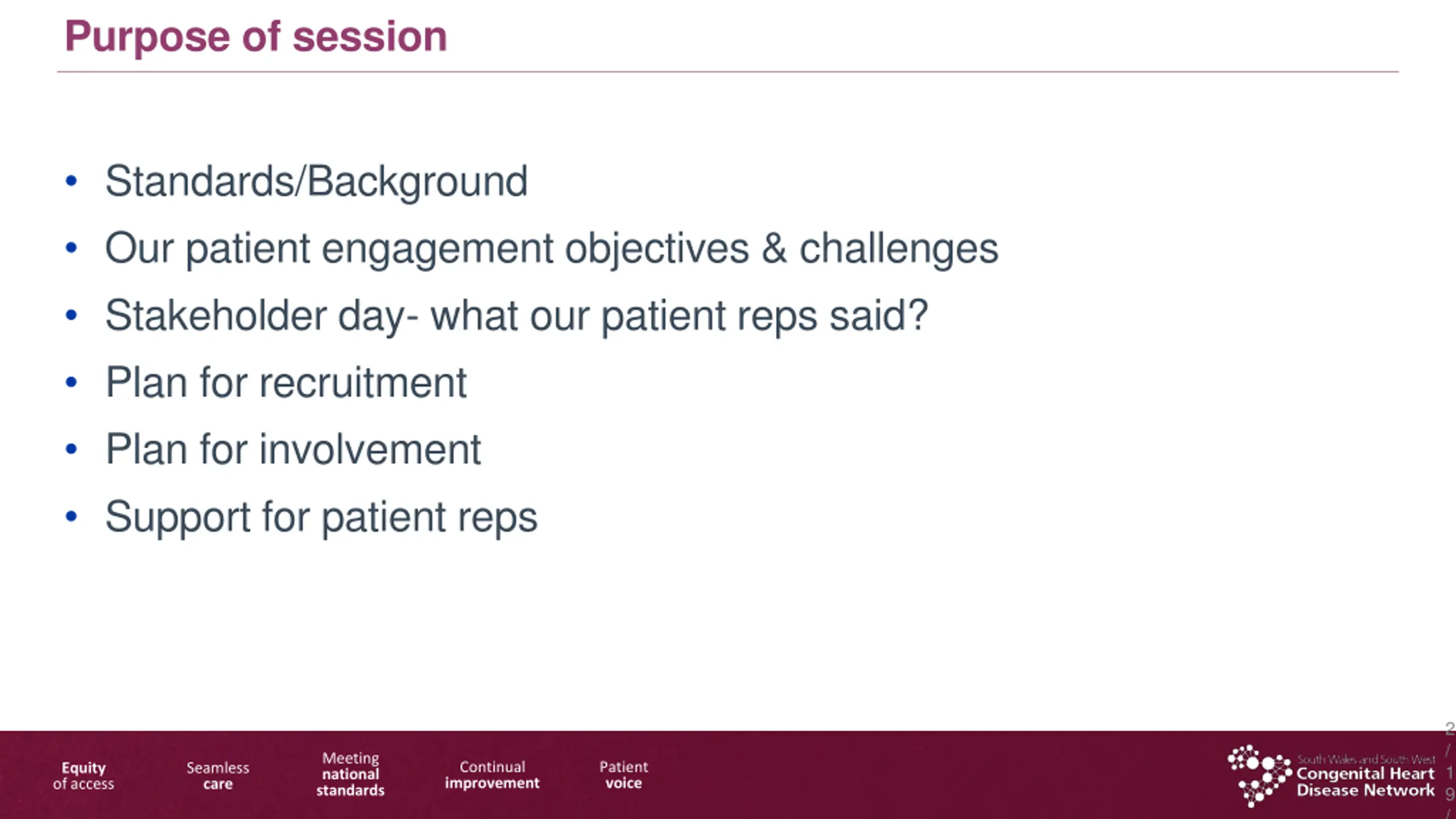 Purpose of session Standards/Background Our patient engagement objectives & challenges Stakeholder day- what our patient reps said? Plan for recruitment Plan for involvement Support for patient reps 2 / 1 9 / Meeting national standards Continual improvement Patient voice Equity of access Seamless care