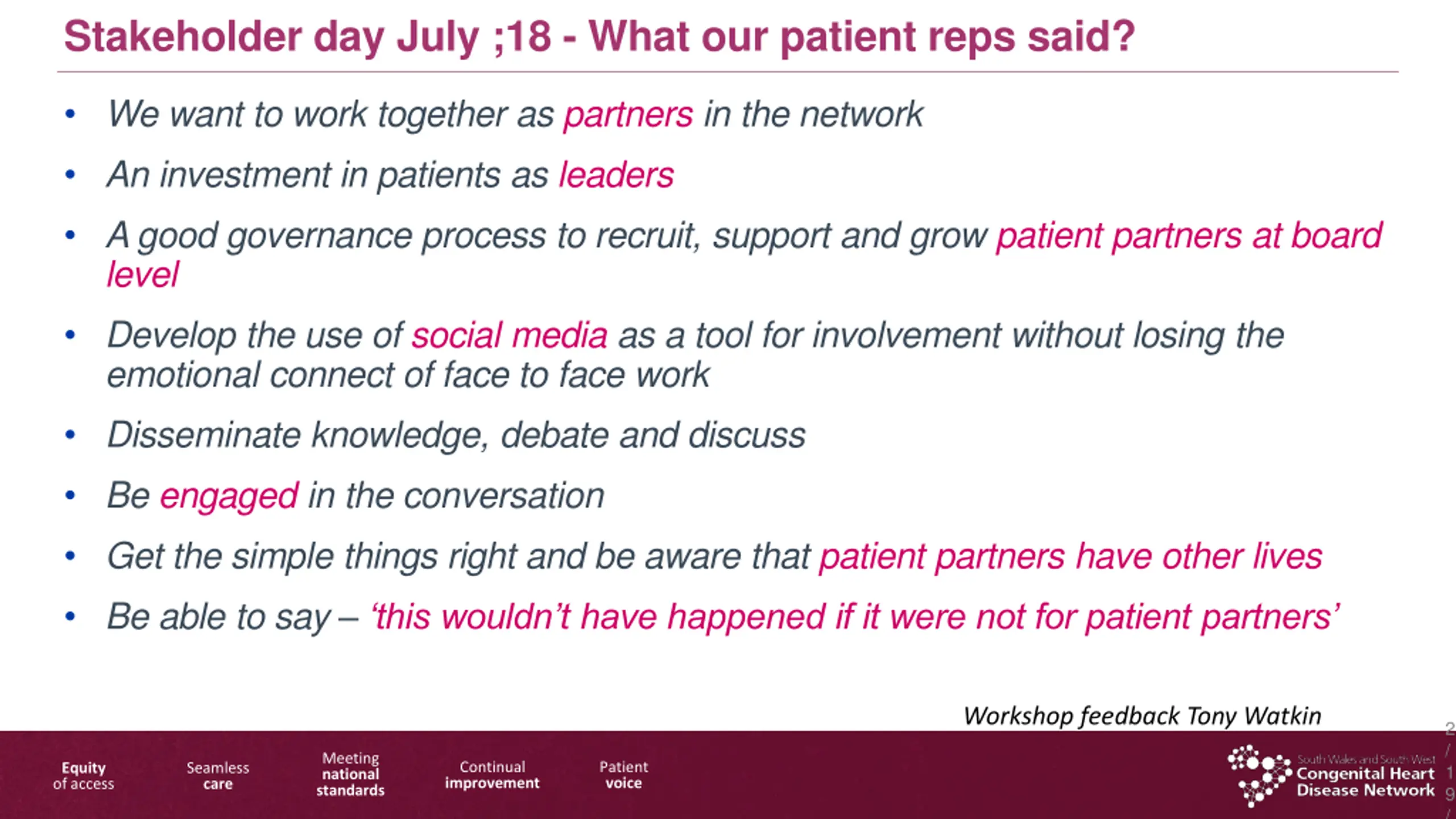 Stakeholder day July ;18 - What our patient reps said? We want to work together as partners in the network An investment in patients as leaders A good governance process to recruit, support and grow patient partners at board level Develop the use of social media as a tool for involvement without losing the emotional connect of face to face work Disseminate knowledge, debate and discuss Be engaged in the conversation Get the simple things right and be aware that patient partners have other lives Be able to say this wouldn t have happened if it were not for patient partners Workshop feedback Tony Watkin 2 / 1 9 / Meeting national standards Continual improvement Patient voice Equity of access Seamless care