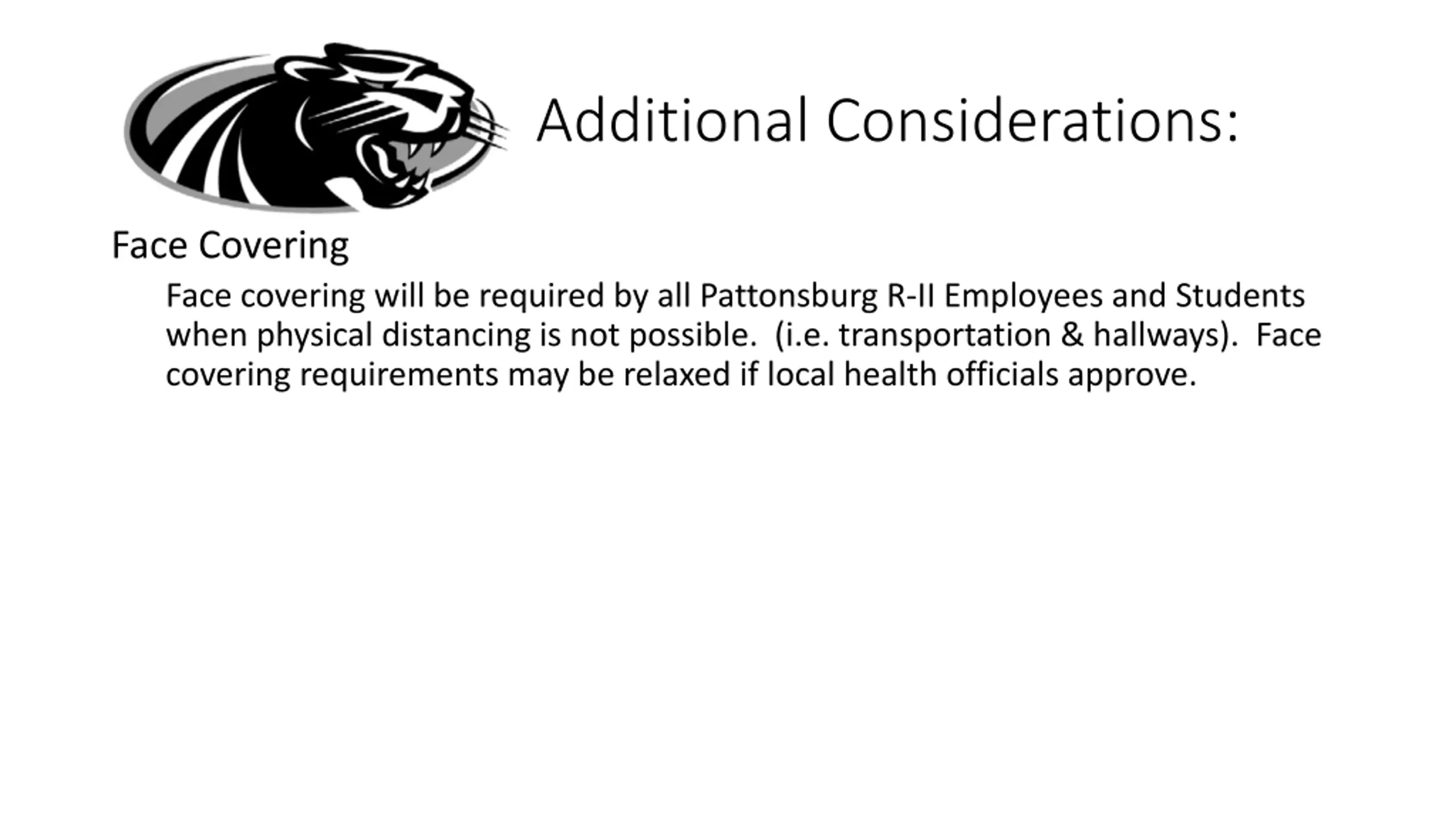 Additional Considerations: Face Covering Face covering will be required by all Pattonsburg R-II Employees and Students when physical distancing is not possible. (i.e. transportation & hallways). Face covering requirements may be relaxed if local health officials approve.