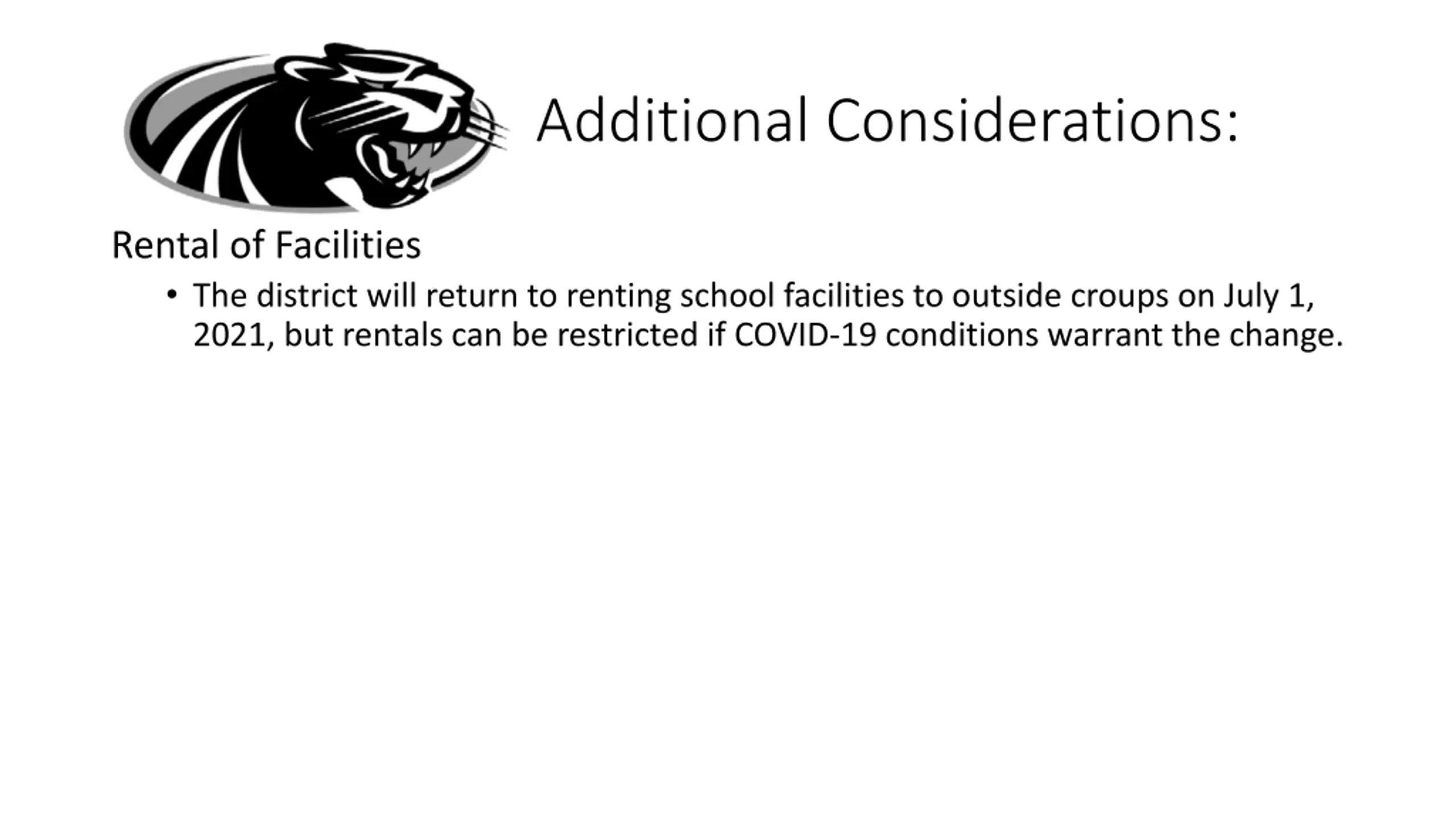 Additional Considerations: Rental of Facilities The district will return to renting school facilities to outside croups on July 1, 2021, but rentals can be restricted if COVID-19 conditions warrant the change.