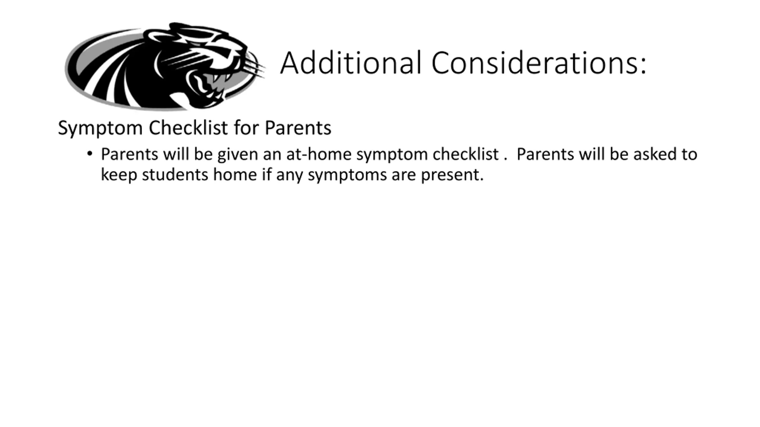 Additional Considerations: Symptom Checklist for Parents Parents will be given an at-home symptom checklist . Parents will be asked to keep students home if any symptoms are present.