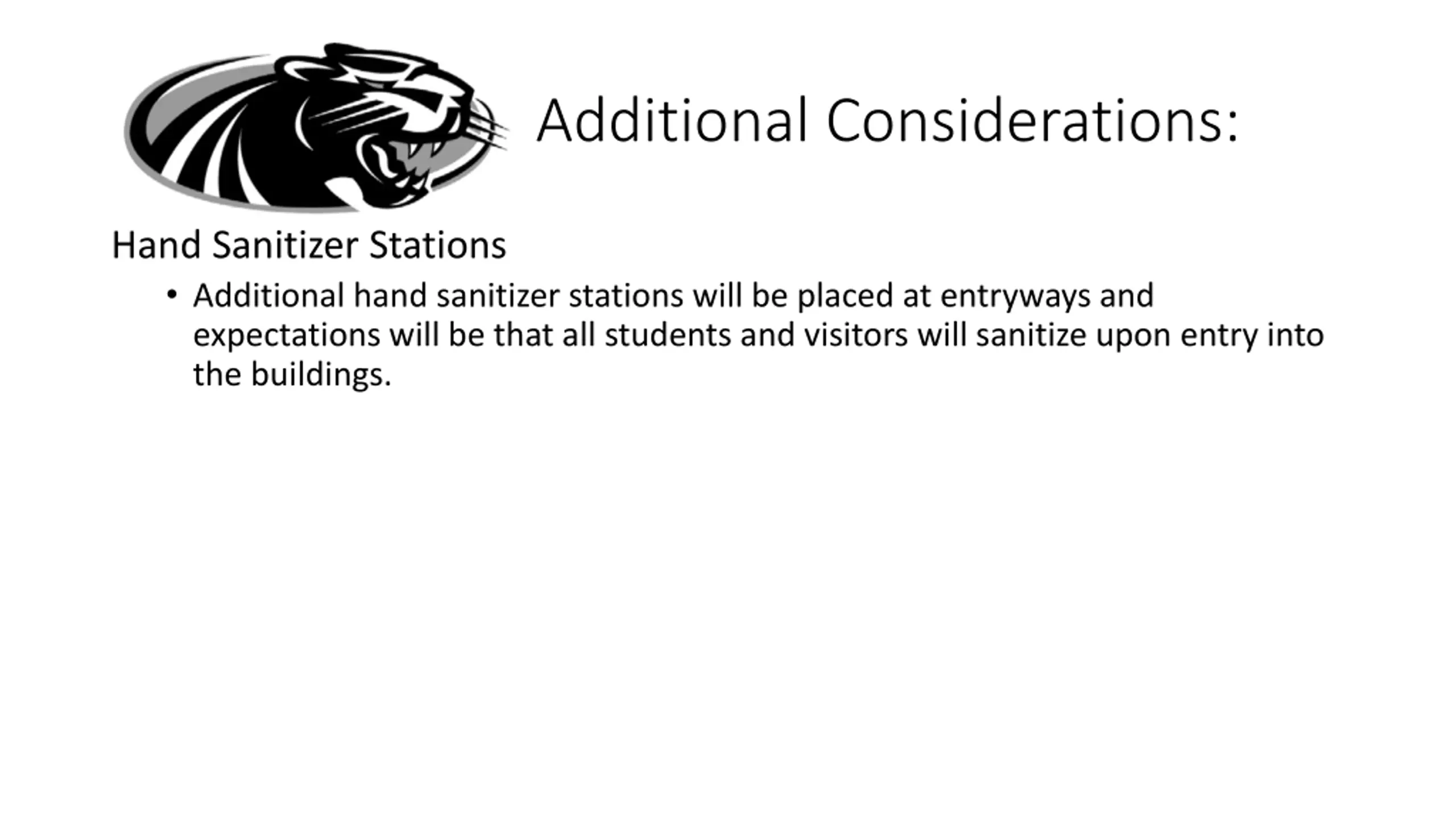 Additional Considerations: Hand Sanitizer Stations Additional hand sanitizer stations will be placed at entryways and expectations will be that all students and visitors will sanitize upon entry into the buildings.