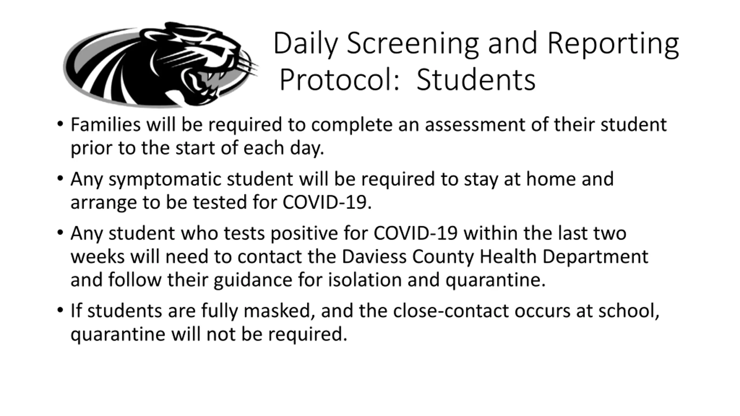 Daily Screening and Reporting Protocol: Students Families will be required to complete an assessment of their student prior to the start of each day. Any symptomatic student will be required to stay at home and arrange to be tested for COVID-19. Any student who tests positive for COVID-19 within the last two weeks will need to contact the Daviess County Health Department and follow their guidance for isolation and quarantine. If students are fully masked, and the close-contact occurs at school, quarantine will not be required.