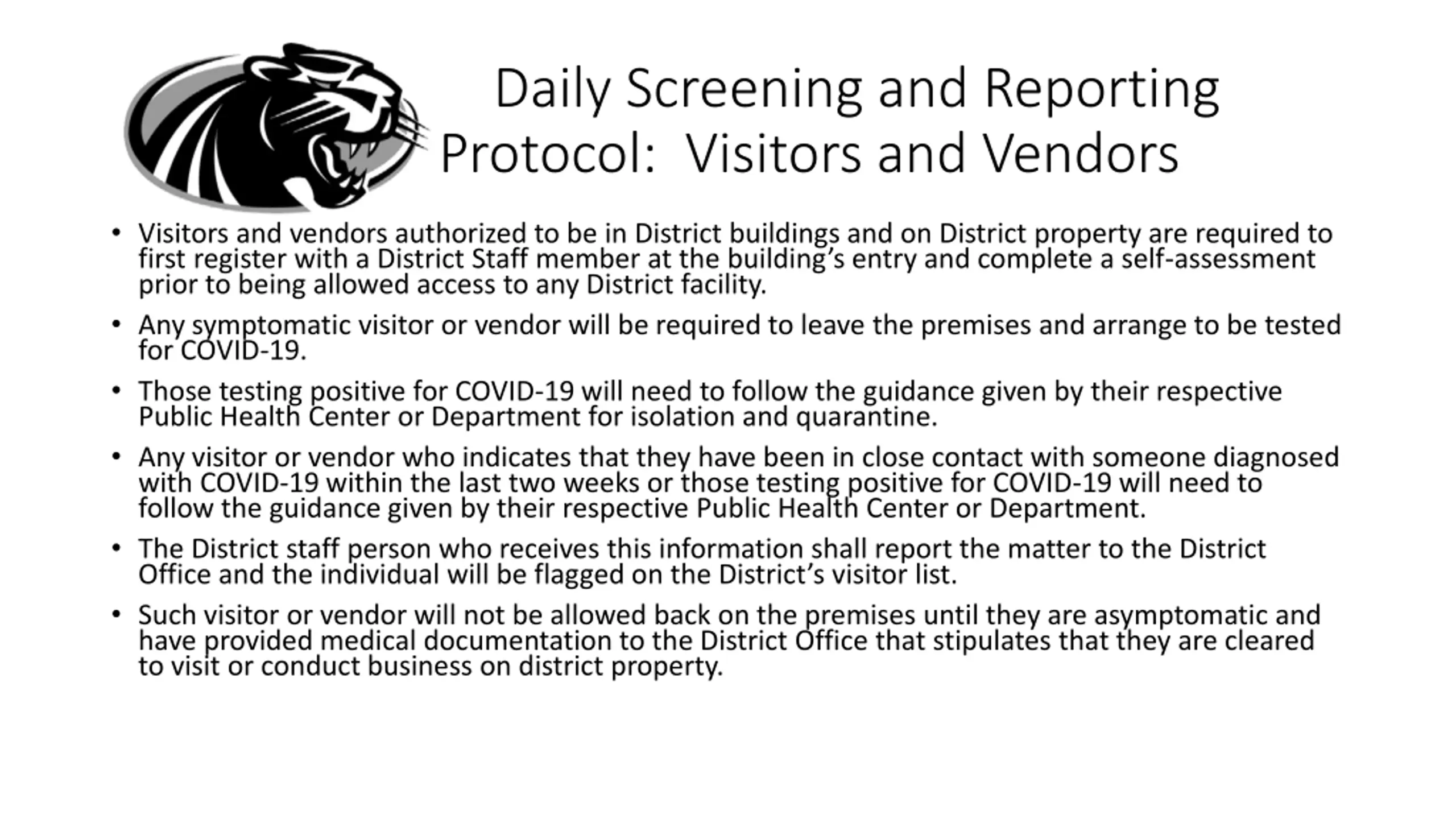 Daily Screening and Reporting Protocol: Visitors and Vendors Visitors and vendors authorized to be in District buildings and on District property are required to first register with a District Staff member at the building s entry and complete a self-assessment prior to being allowed access to any District facility. Any symptomatic visitor or vendor will be required to leave the premises and arrange to be tested for COVID-19. Those testing positive for COVID-19 will need to follow the guidance given by their respective Public Health Center or Department for isolation and quarantine. Any visitor or vendor who indicates that they have been in close contact with someone diagnosed with COVID-19 within the last two weeks or those testing positive for COVID-19 will need to follow the guidance given by their respective Public Health Center or Department. The District staff person who receives this information shall report the matter to the District Office and the individual will be flagged on the District s visitor list. Such visitor or vendor will not be allowed back on the premises until they are asymptomatic and have provided medical documentation to the District Office that stipulates that they are cleared to visit or conduct business on district property.