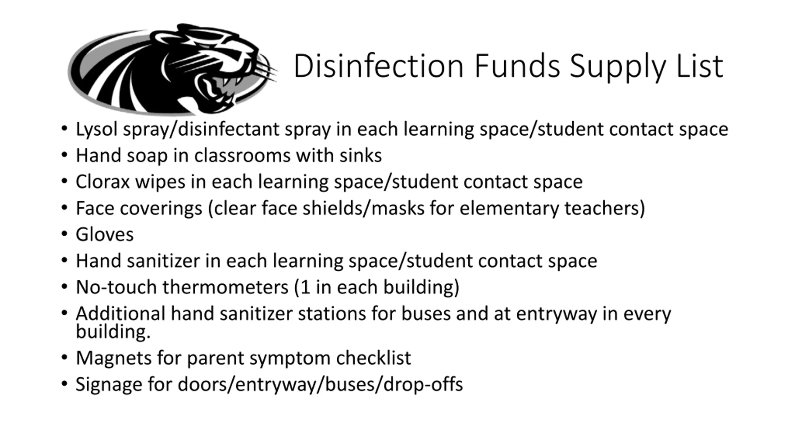 Disinfection Funds Supply List Lysol spray/disinfectant spray in each learning space/student contact space Hand soap in classrooms with sinks Clorax wipes in each learning space/student contact space Face coverings (clear face shields/masks for elementary teachers) Gloves Hand sanitizer in each learning space/student contact space No-touch thermometers (1 in each building) Additional hand sanitizer stations for buses and at entryway in every building. Magnets for parent symptom checklist Signage for doors/entryway/buses/drop-offs
