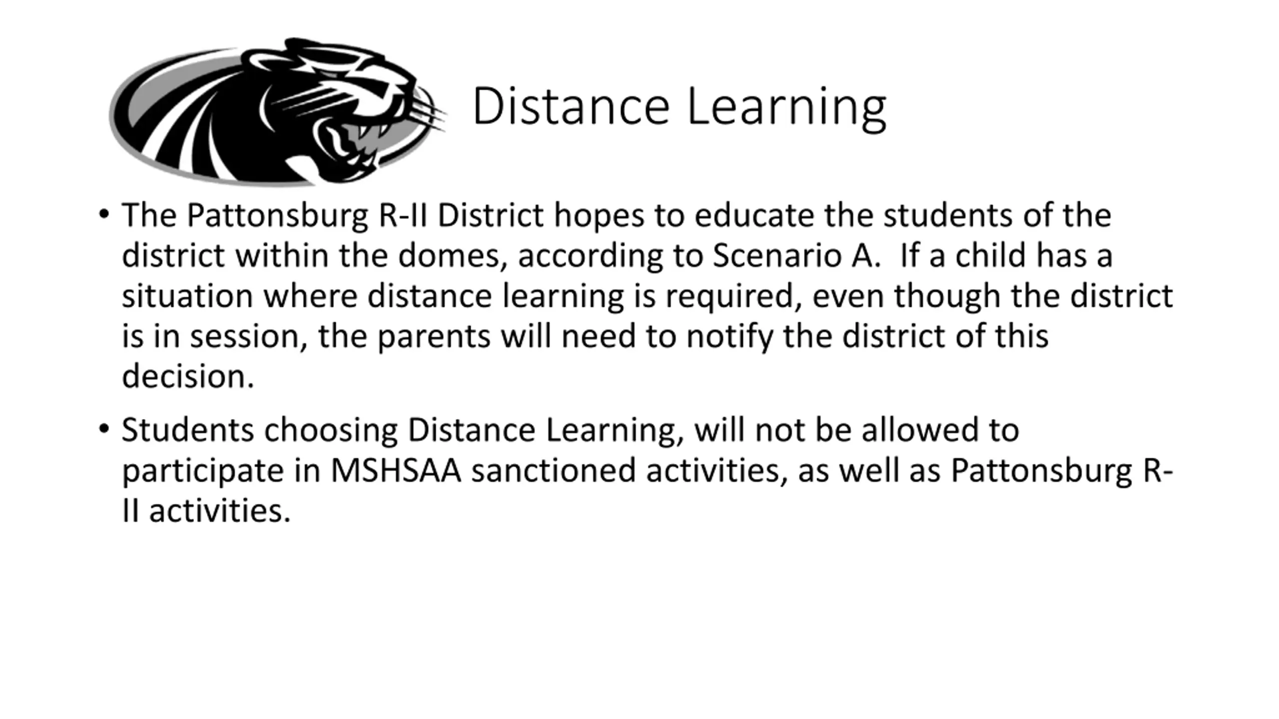 Distance Learning The Pattonsburg R-II District hopes to educate the students of the district within the domes, according to Scenario A. If a child has a situation where distance learning is required, even though the district is in session, the parents will need to notify the district of this decision. Students choosing Distance Learning, will not be allowed to participate in MSHSAA sanctioned activities, as well as Pattonsburg R- II activities.