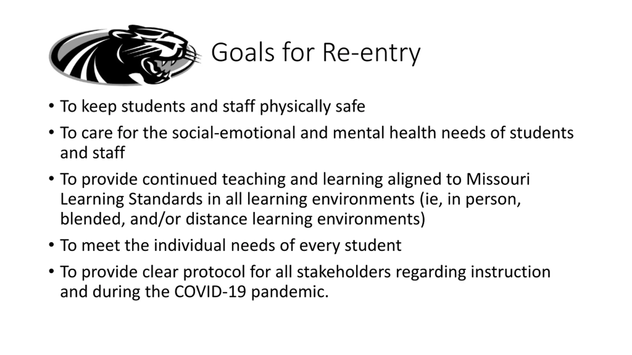 Goals for Re-entry To keep students and staff physically safe To care for the social-emotional and mental health needs of students and staff To provide continued teaching and learning aligned to Missouri Learning Standards in all learning environments (ie, in person, blended, and/or distance learning environments) To meet the individual needs of every student To provide clear protocol for all stakeholders regarding instruction and during the COVID-19 pandemic.