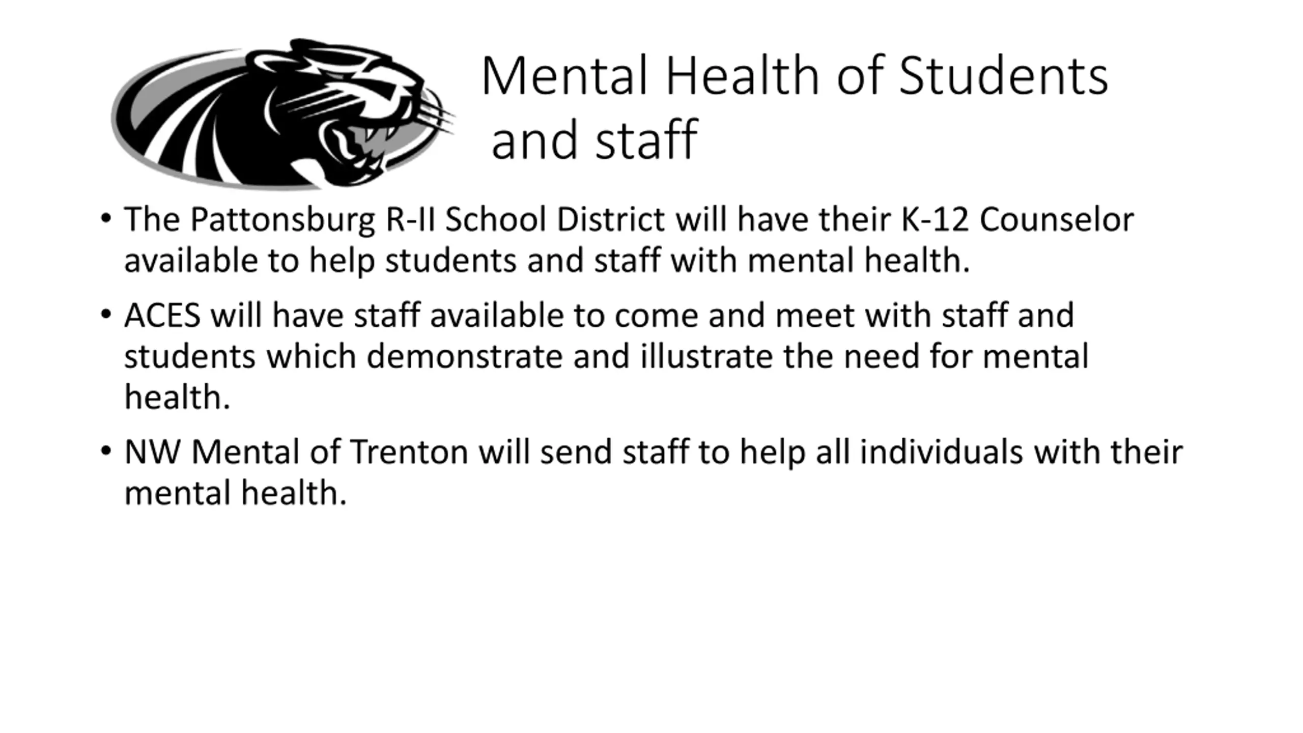 Mental Health of Students and staff The Pattonsburg R-II School District will have their K-12 Counselor available to help students and staff with mental health. ACES will have staff available to come and meet with staff and students which demonstrate and illustrate the need for mental health. NW Mental of Trenton will send staff to help all individuals with their mental health.