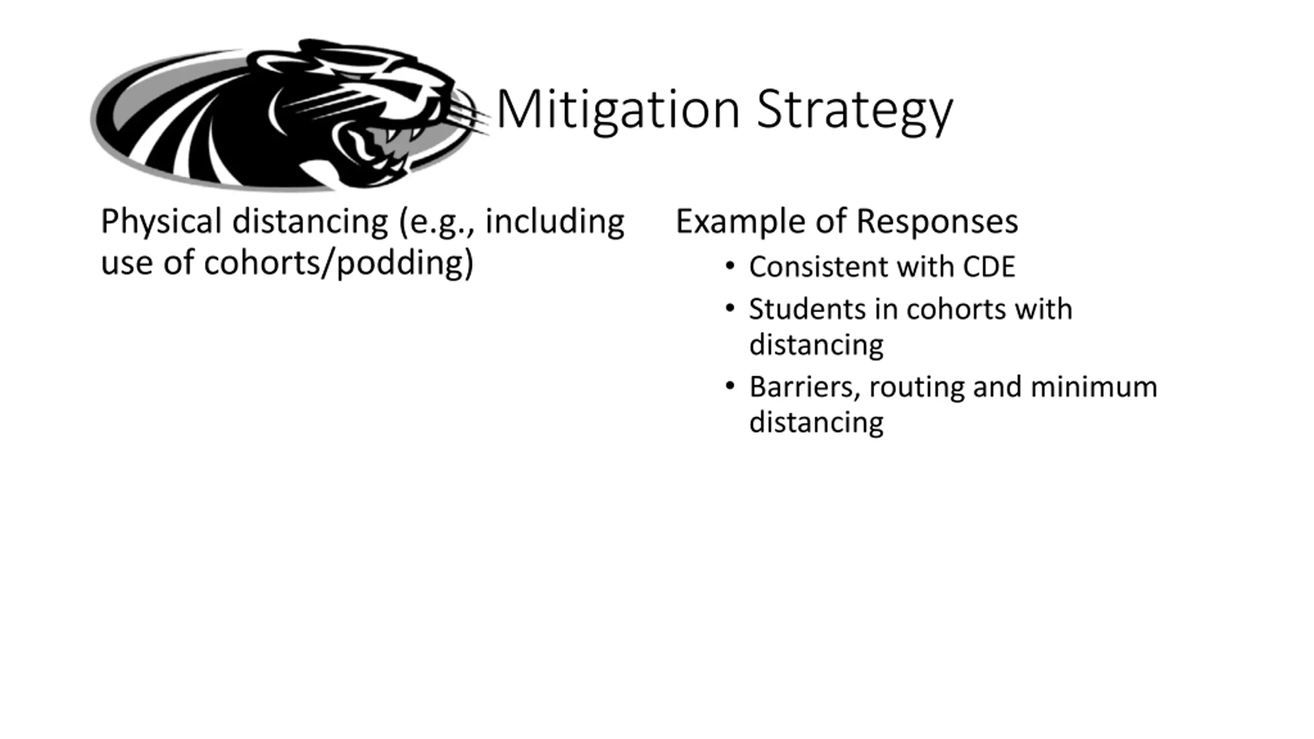 Mitigation Strategy Physical distancing (e.g., including use of cohorts/podding) Example of Responses Consistent with CDE Students in cohorts with distancing Barriers, routing and minimum distancing