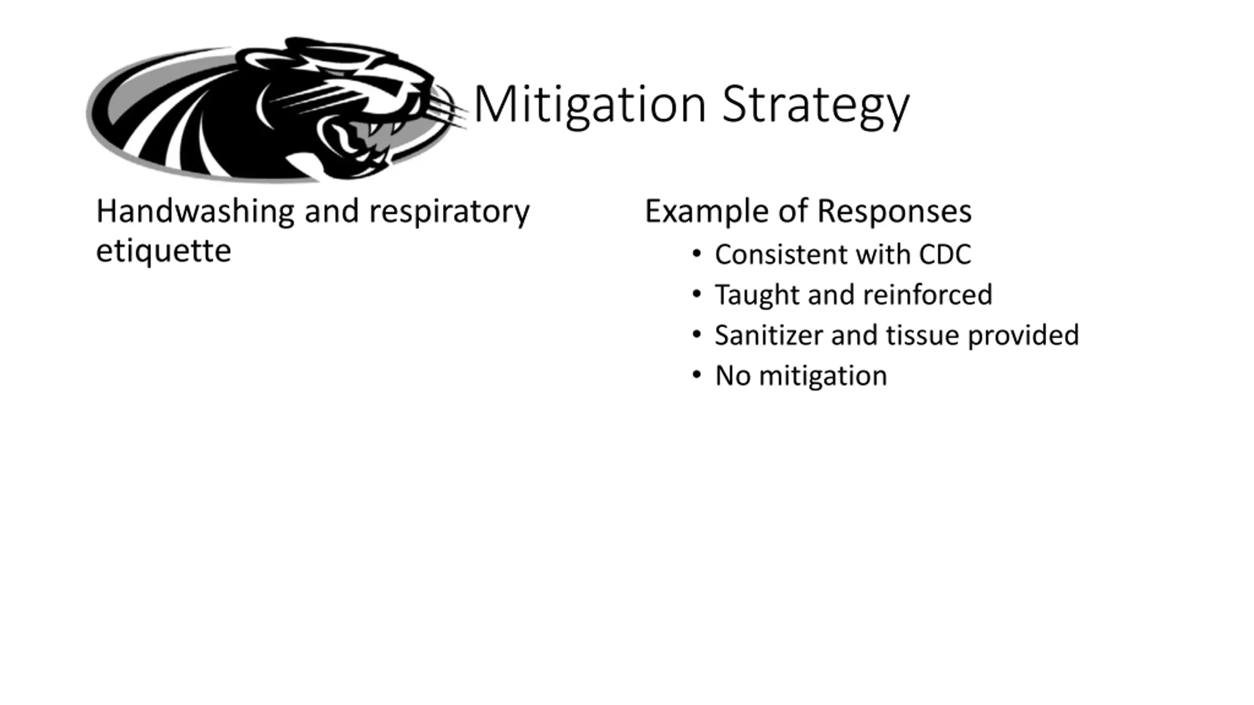 Mitigation Strategy Handwashing and respiratory etiquette Example of Responses Consistent with CDC Taught and reinforced Sanitizer and tissue provided No mitigation