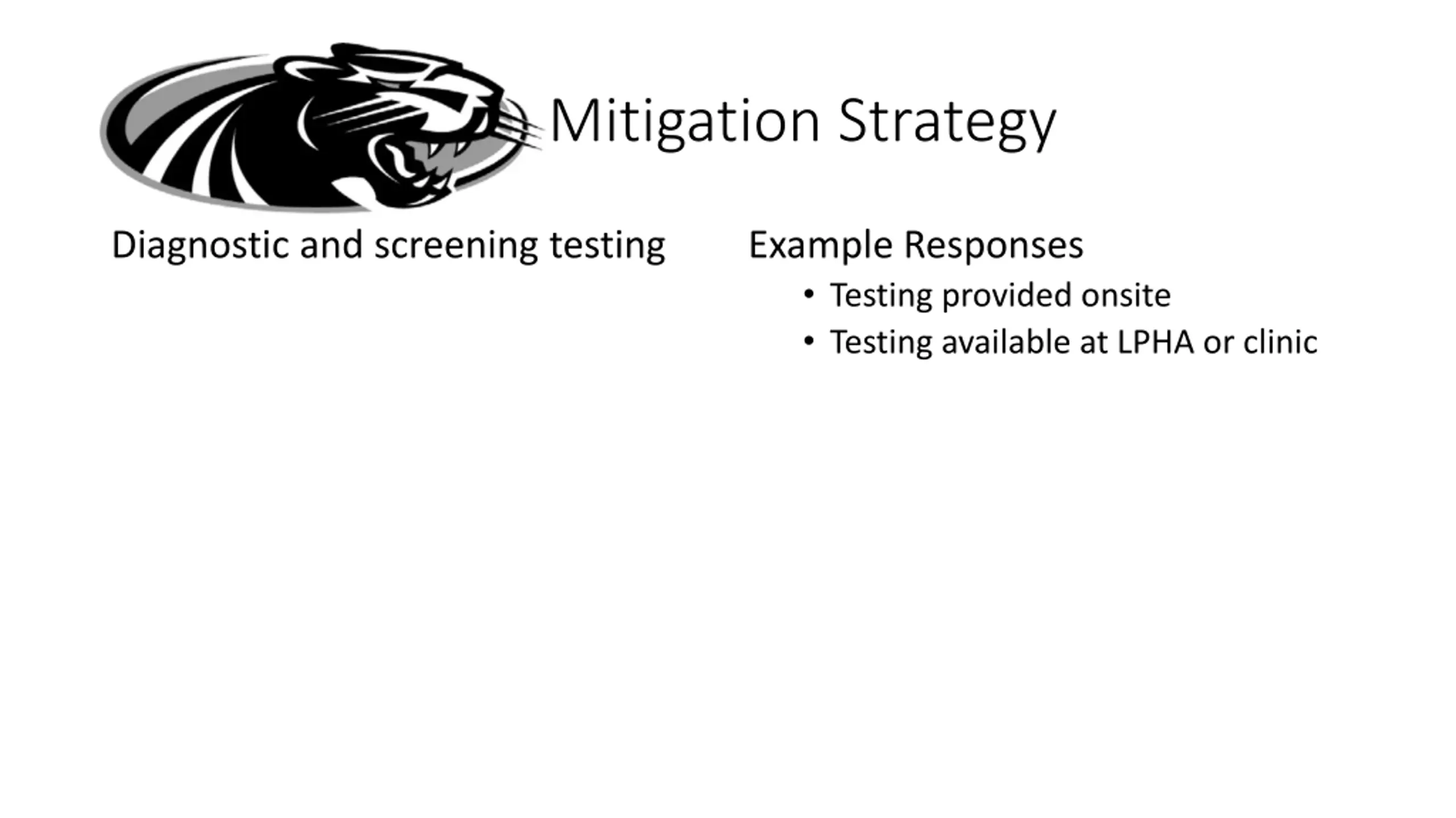 Mitigation Strategy Diagnostic and screening testing Example Responses Testing provided onsite Testing available at LPHA or clinic