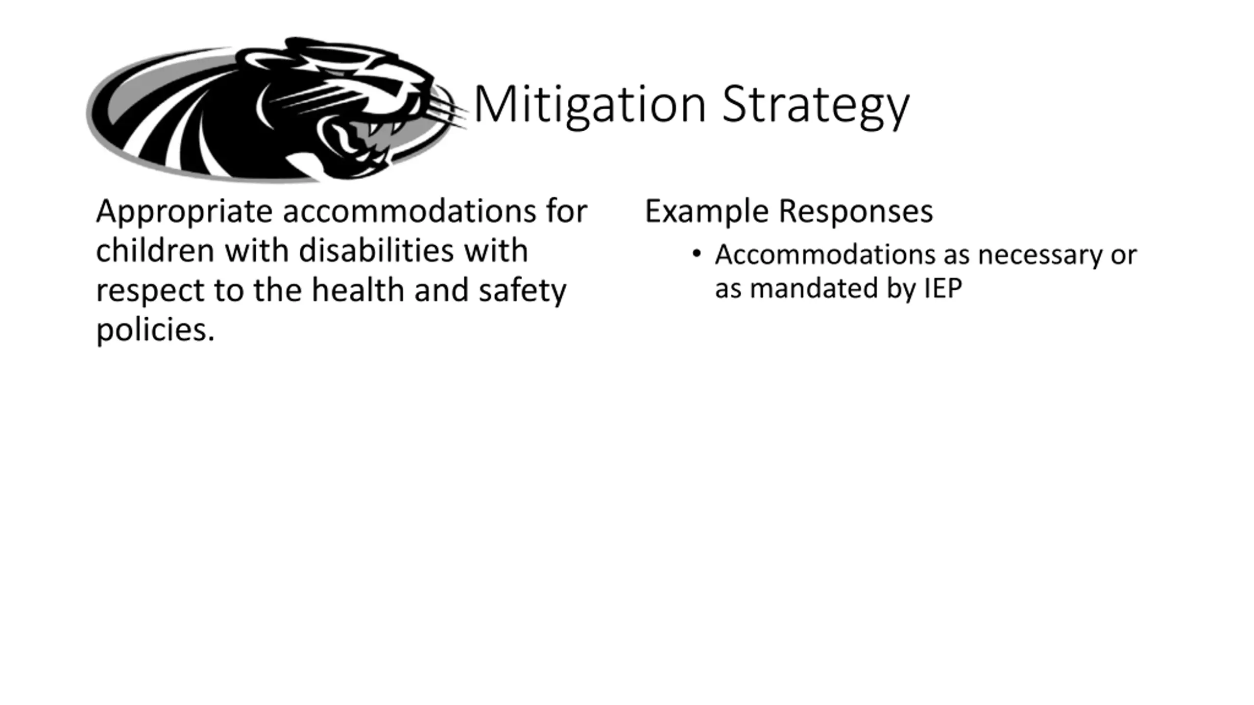 Mitigation Strategy Appropriate accommodations for children with disabilities with respect to the health and safety policies. Example Responses Accommodations as necessary or as mandated by IEP
