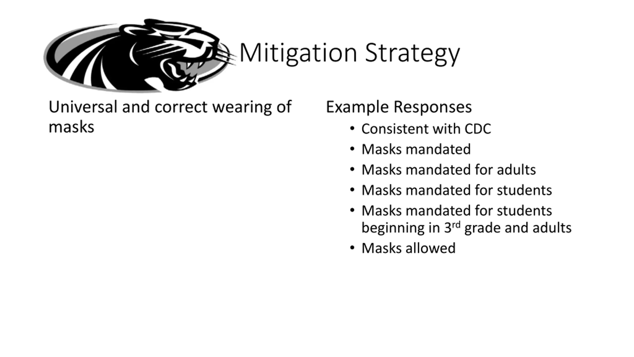 Mitigation Strategy Universal and correct wearing of masks Example Responses Consistent with CDC Masks mandated Masks mandated for adults Masks mandated for students Masks mandated for students beginning in 3rd grade and adults Masks allowed