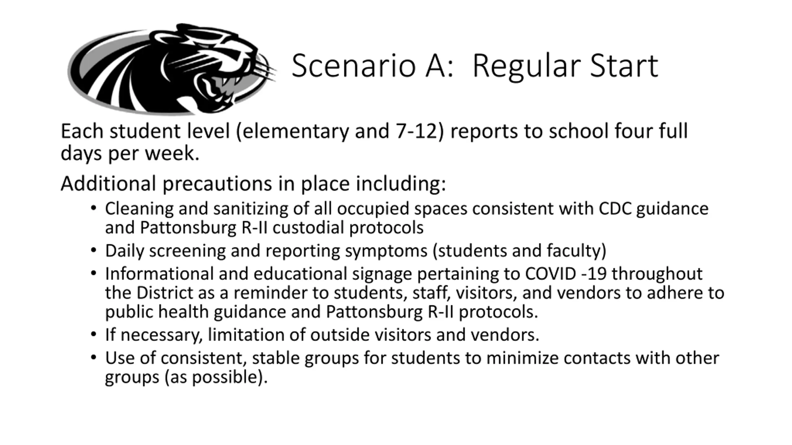 Scenario A: Regular Start Each student level (elementary and 7-12) reports to school four full days per week. Additional precautions in place including: Cleaning and sanitizing of all occupied spaces consistent with CDC guidance and Pattonsburg R-II custodial protocols Daily screening and reporting symptoms (students and faculty) Informational and educational signage pertaining to COVID -19 throughout the District as a reminder to students, staff, visitors, and vendors to adhere to public health guidance and Pattonsburg R-II protocols. If necessary, limitation of outside visitors and vendors. Use of consistent, stable groups for students to minimize contacts with other groups (as possible).
