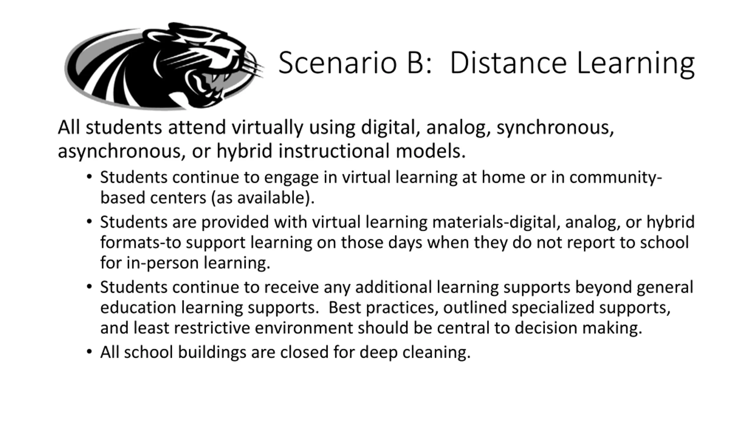 Scenario B: Distance Learning All students attend virtually using digital, analog, synchronous, asynchronous, or hybrid instructional models. Students continue to engage in virtual learning at home or in community- based centers (as available). Students are provided with virtual learning materials-digital, analog, or hybrid formats-to support learning on those days when they do not report to school for in-person learning. Students continue to receive any additional learning supports beyond general education learning supports. Best practices, outlined specialized supports, and least restrictive environment should be central to decision making. All school buildings are closed for deep cleaning.